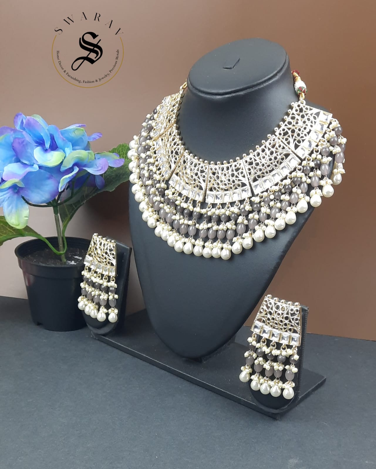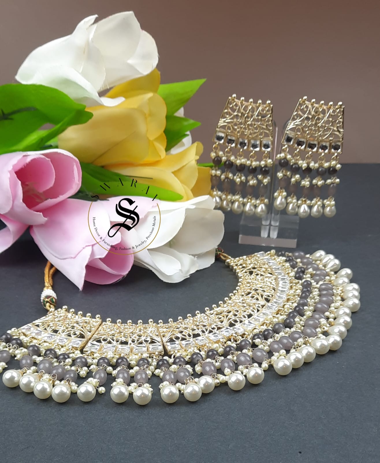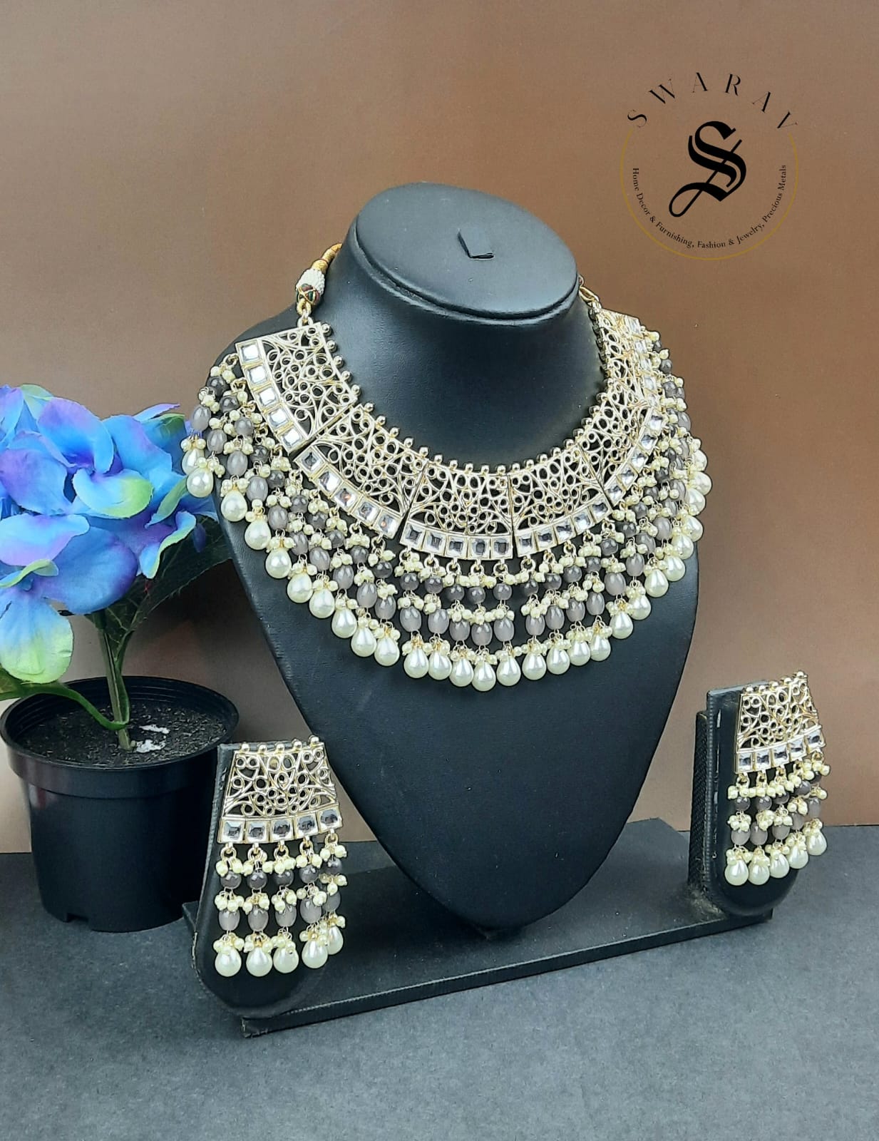 Hand made Kundan and Beads Jaipur Necklace set with Laser cut Design. (Color - Gray )
