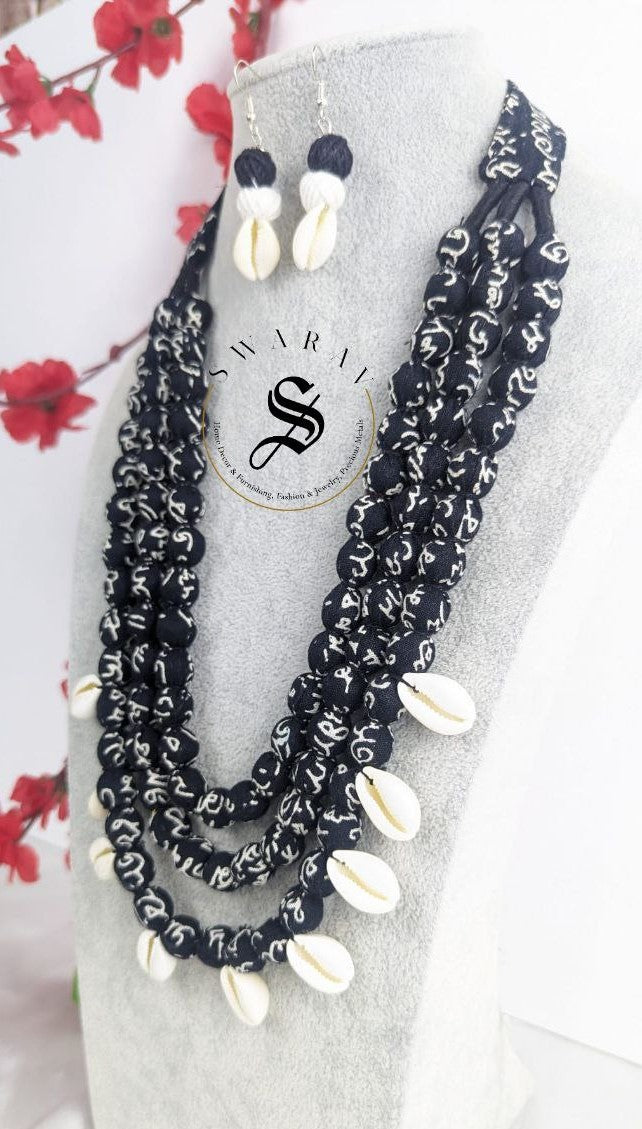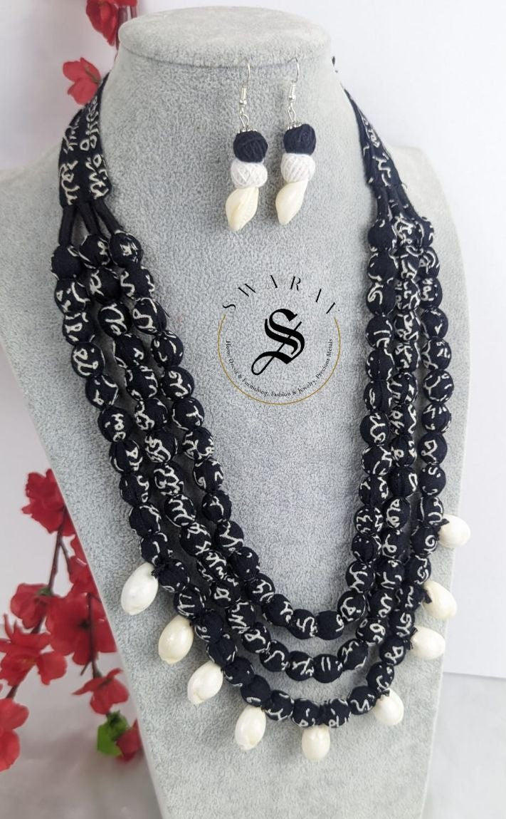 Hand made script print Fabric ball 3 layer Haar/ long necklace in black and white print with matching earrings with sea shells - Design Code - D5