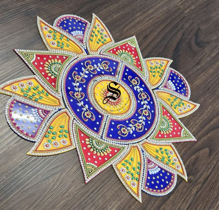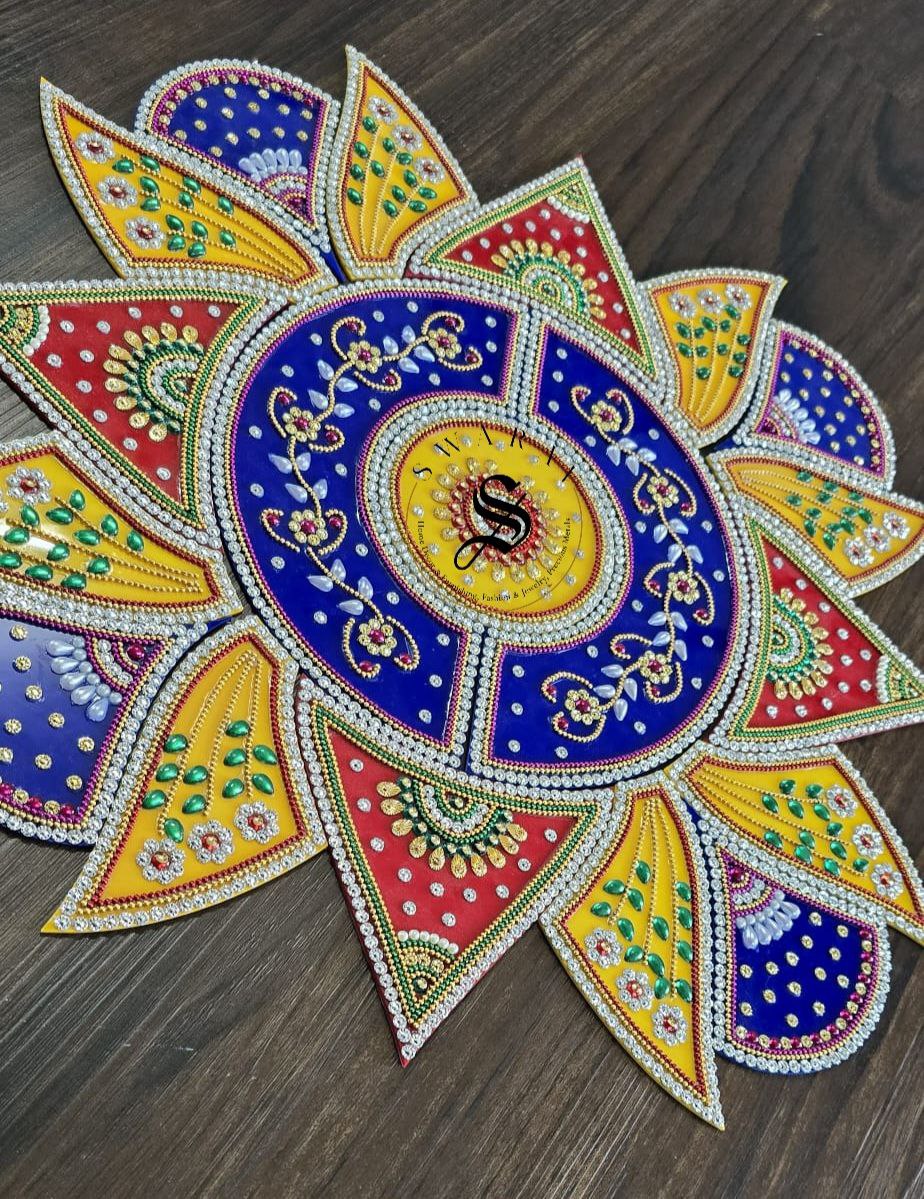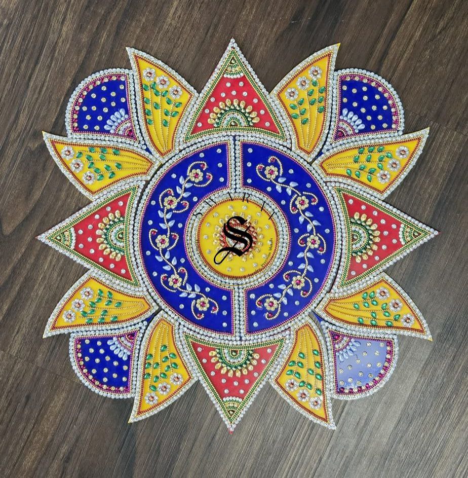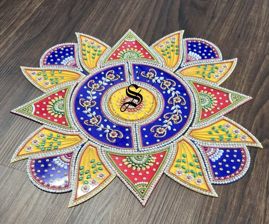 Bring home this beautiful vibrant festive special multi color , completely hand made Acrylic Rangoli set of 19 pieces to decorate your floor on special occasions.