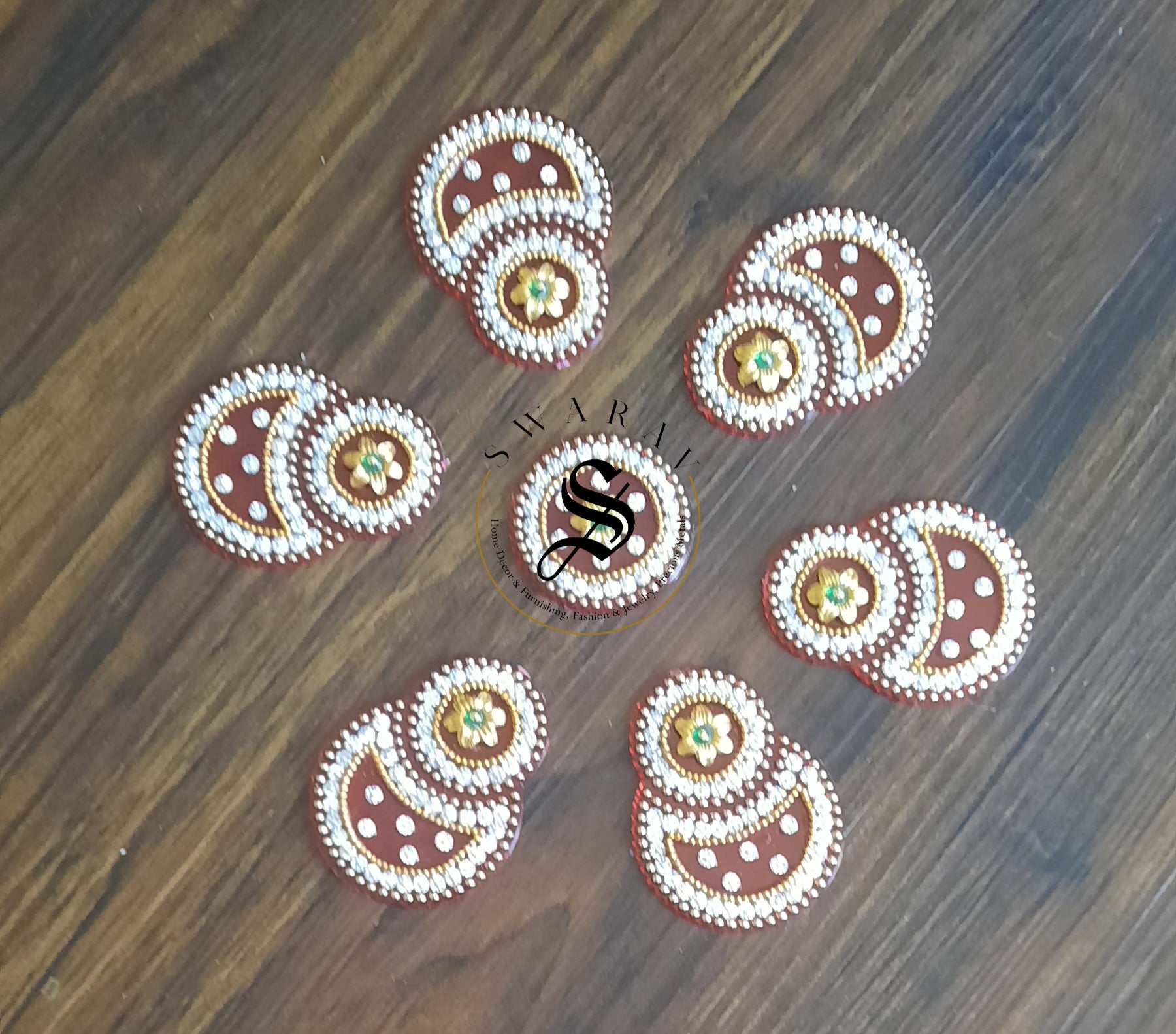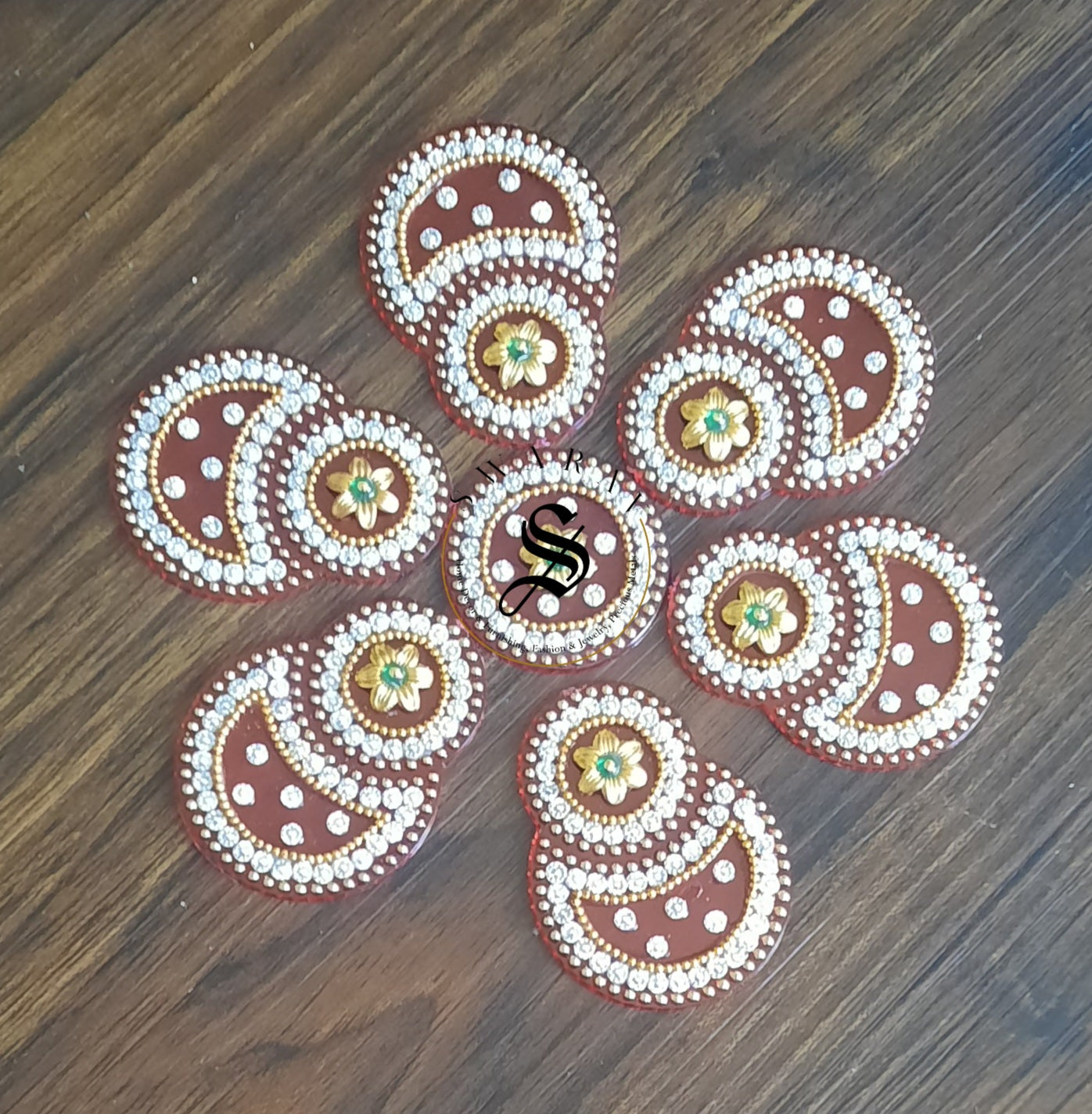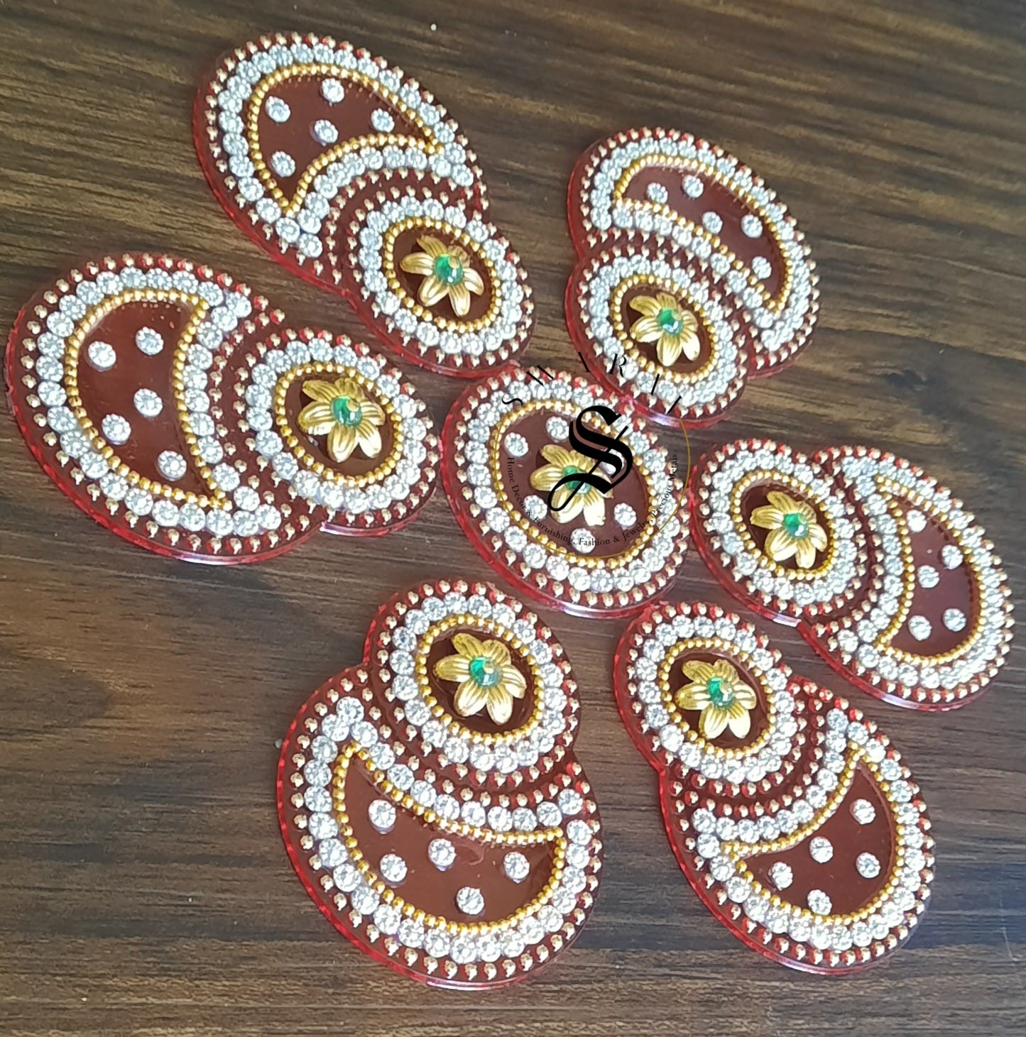 Bring home this beautiful Red color, completely hand made Acrylic Rangoli set of 7 pieces to decorate your floor on special occasions.