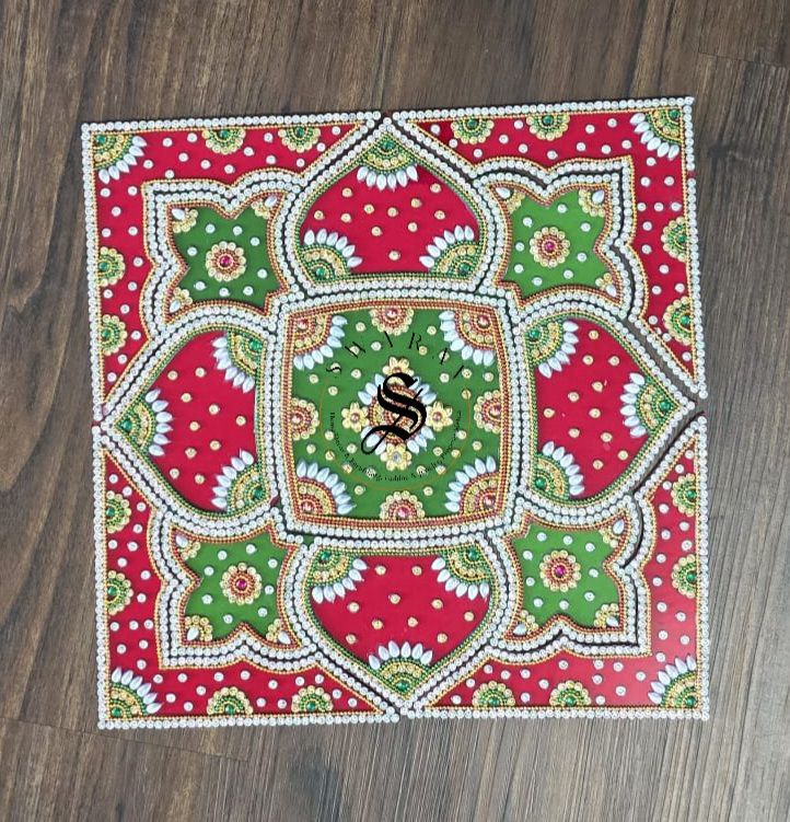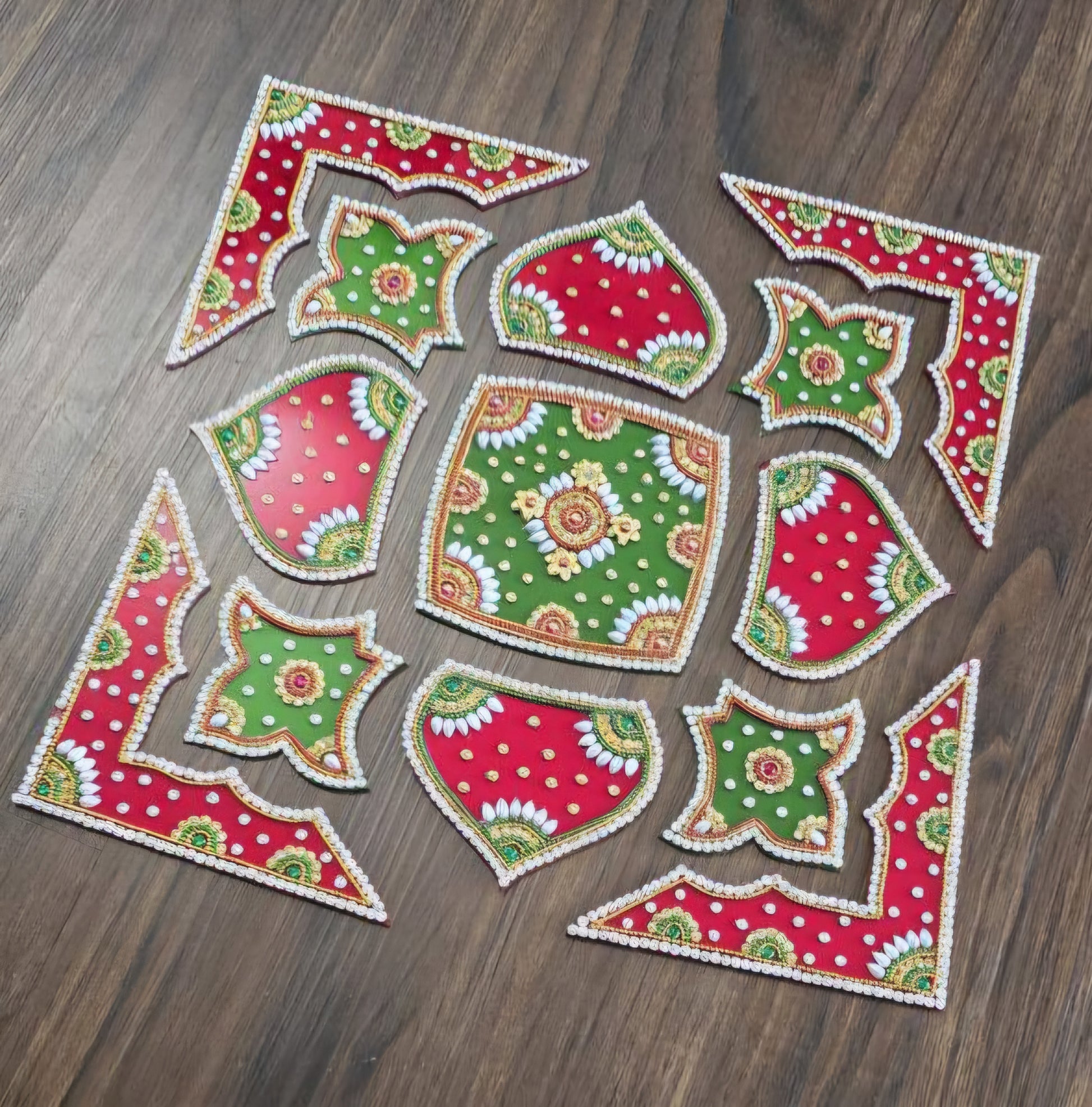 Bring home this beautiful vibrant festive special multi color , completely hand made Acrylic Rangoli set of 13 pieces to decorate your floor on special occasions.