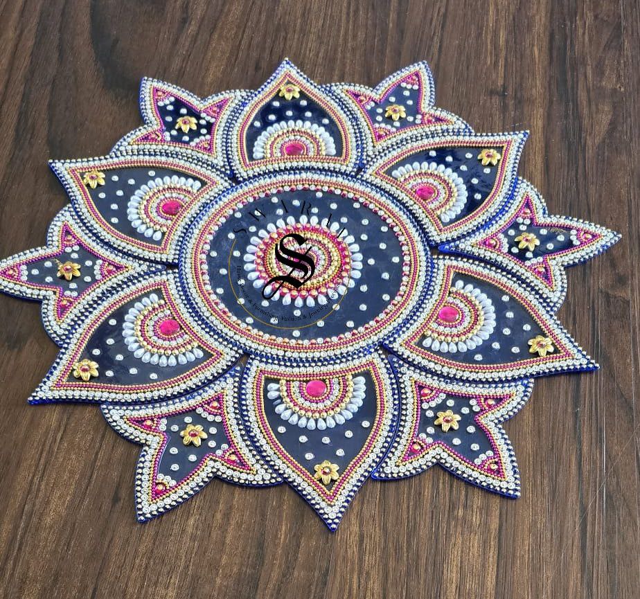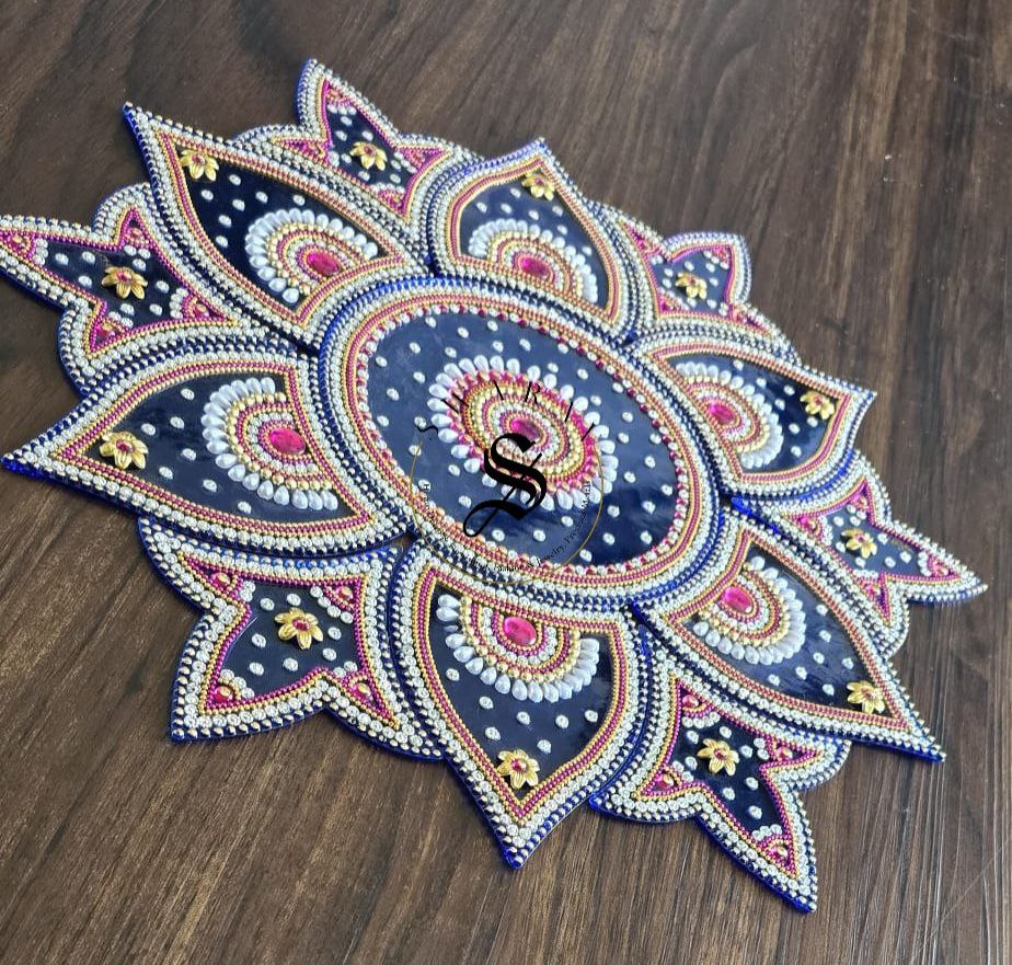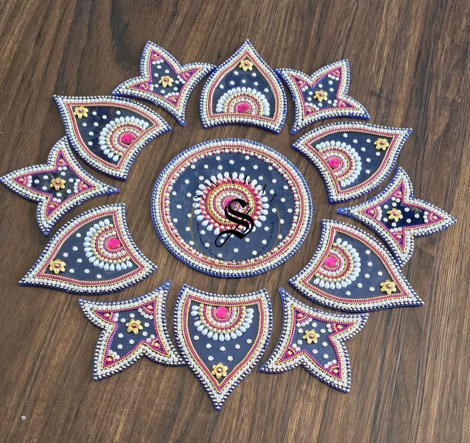 Bring home this beautiful vibrant festive special multi color , completely hand made Acrylic Rangoli set of 13 pieces to decorate your floor on special occasions.