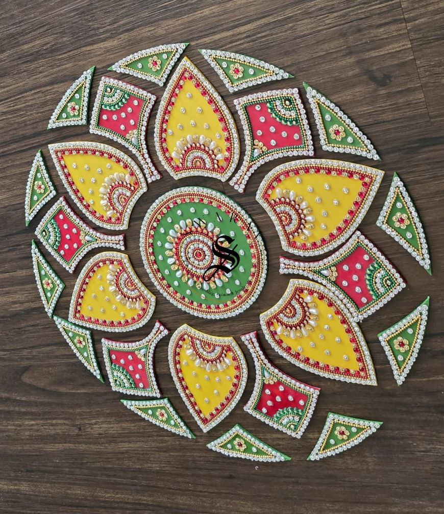 Bring home this beautiful vibrant festive special multi color , completely hand made Acrylic Rangoli set of 26 pieces to decorate your floor on special occasions.
