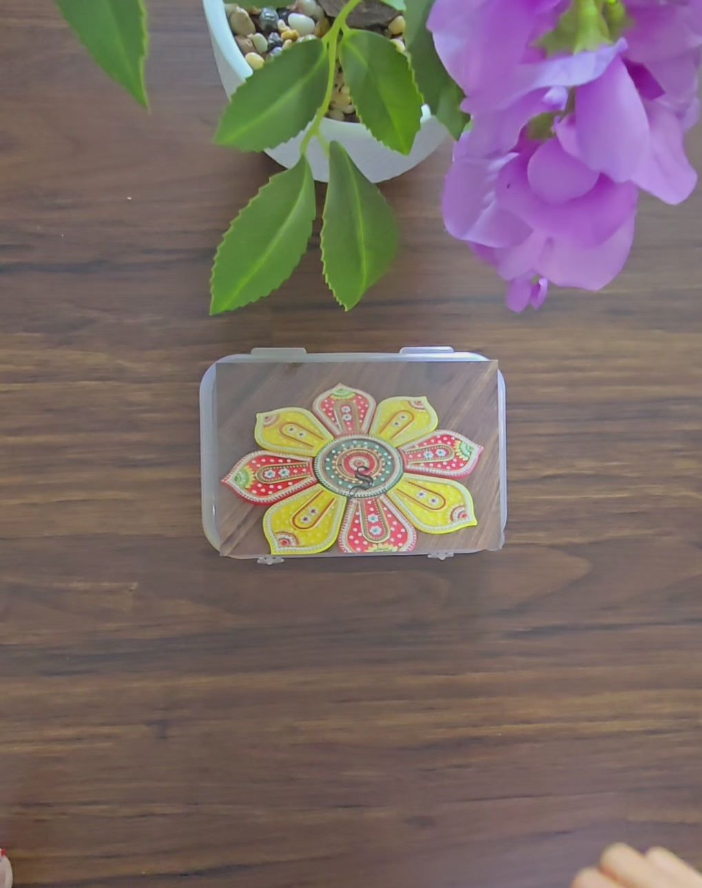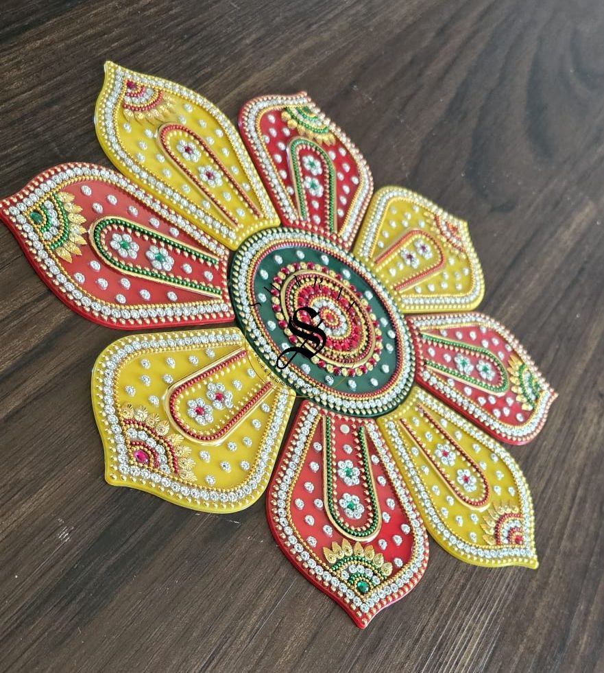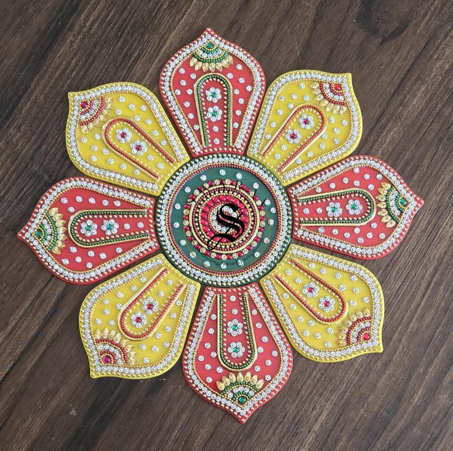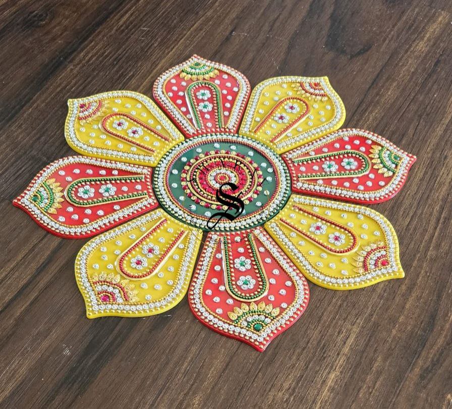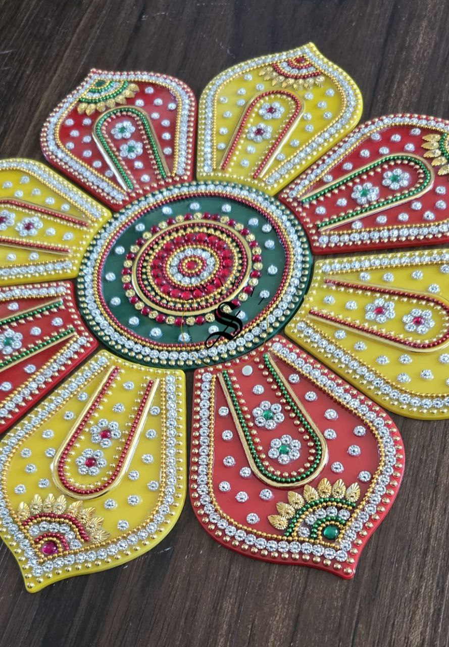 Bring home this beautiful vibrant festive special multi color , completely hand made Acrylic Rangoli set of 9 pieces to decorate your floor on special occasions.
