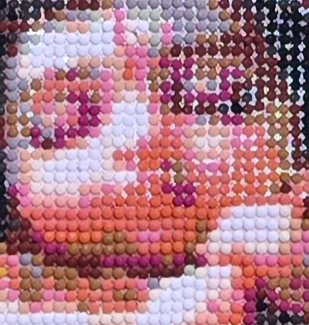 Materials used : Standard sticky adhesive canvas and approx 12,000 multicolor beads stuck on canvas by hand , one at a time, to create the shape.