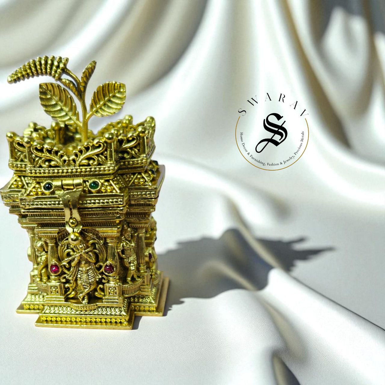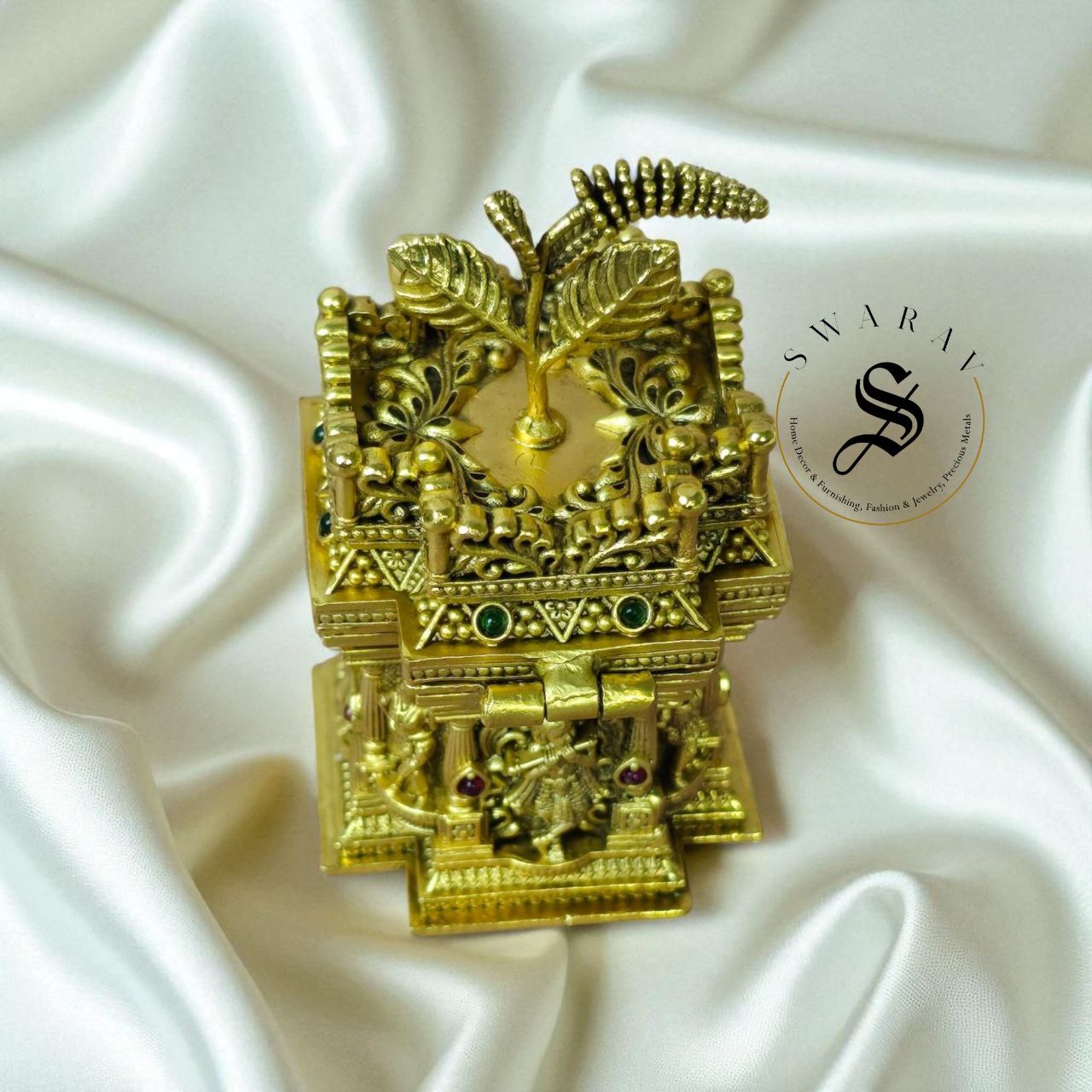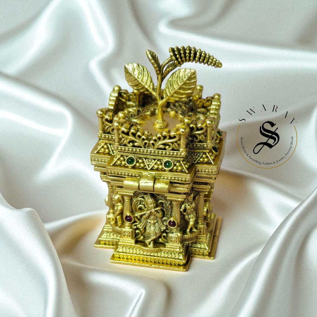 Made of alloy Brass, this beautiful mini kumkum box wwithin Holy basil or Tulasi pot engraving or Nakshi work is a perfect high quality home/Pooja decor essential for self as well as for gifting.