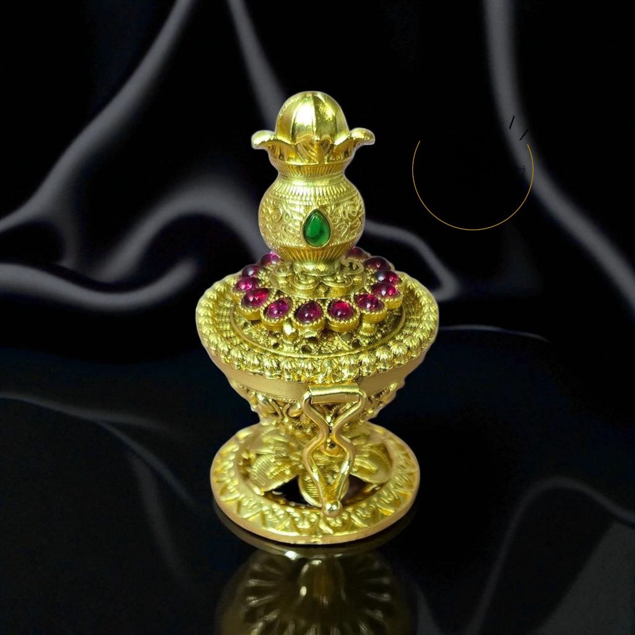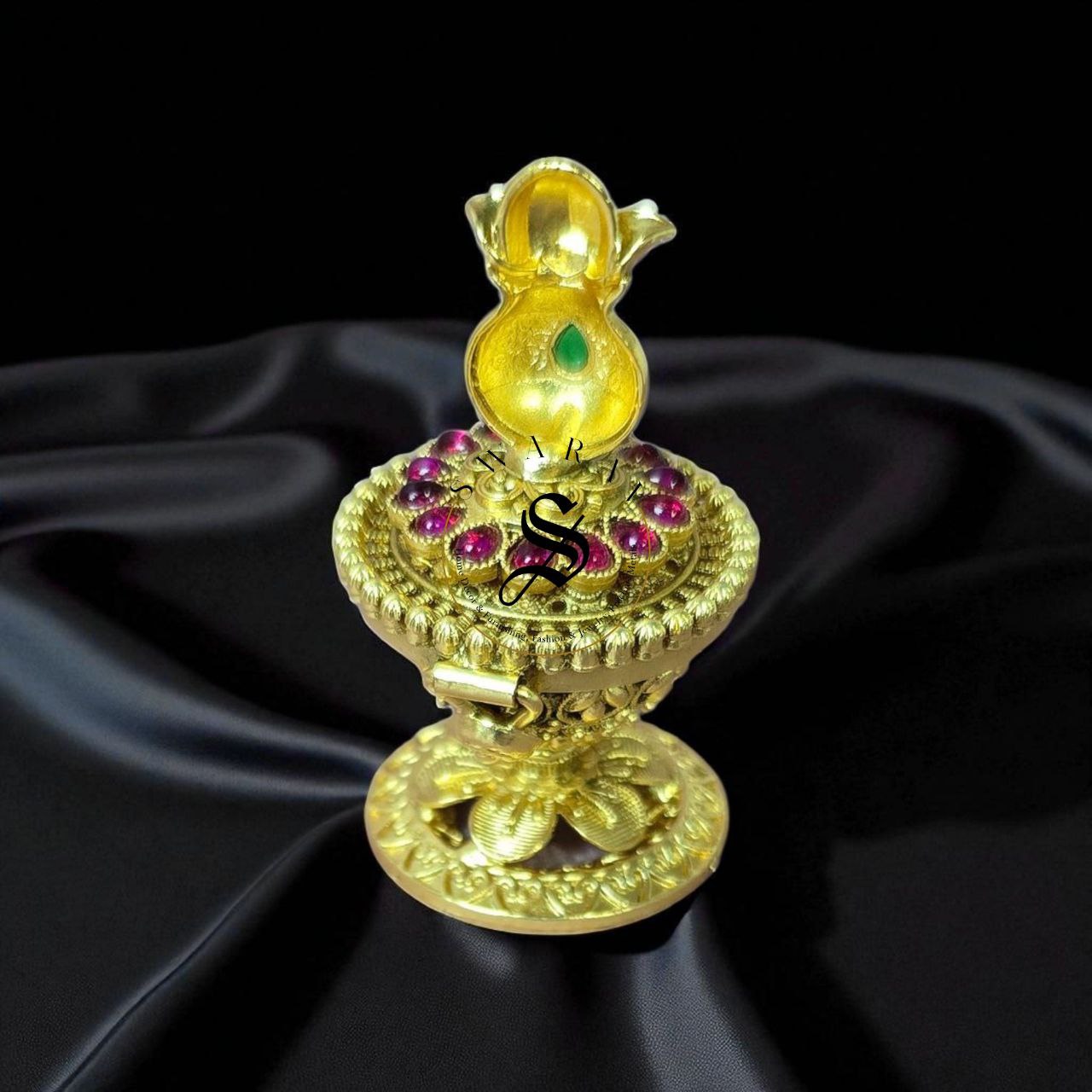 Made of alloy Brass, this beautiful mini kumkum box with small cute Kalash engraving or Nakshi work is a perfect high quality home/Pooja decor essential for self as well as for gifting.