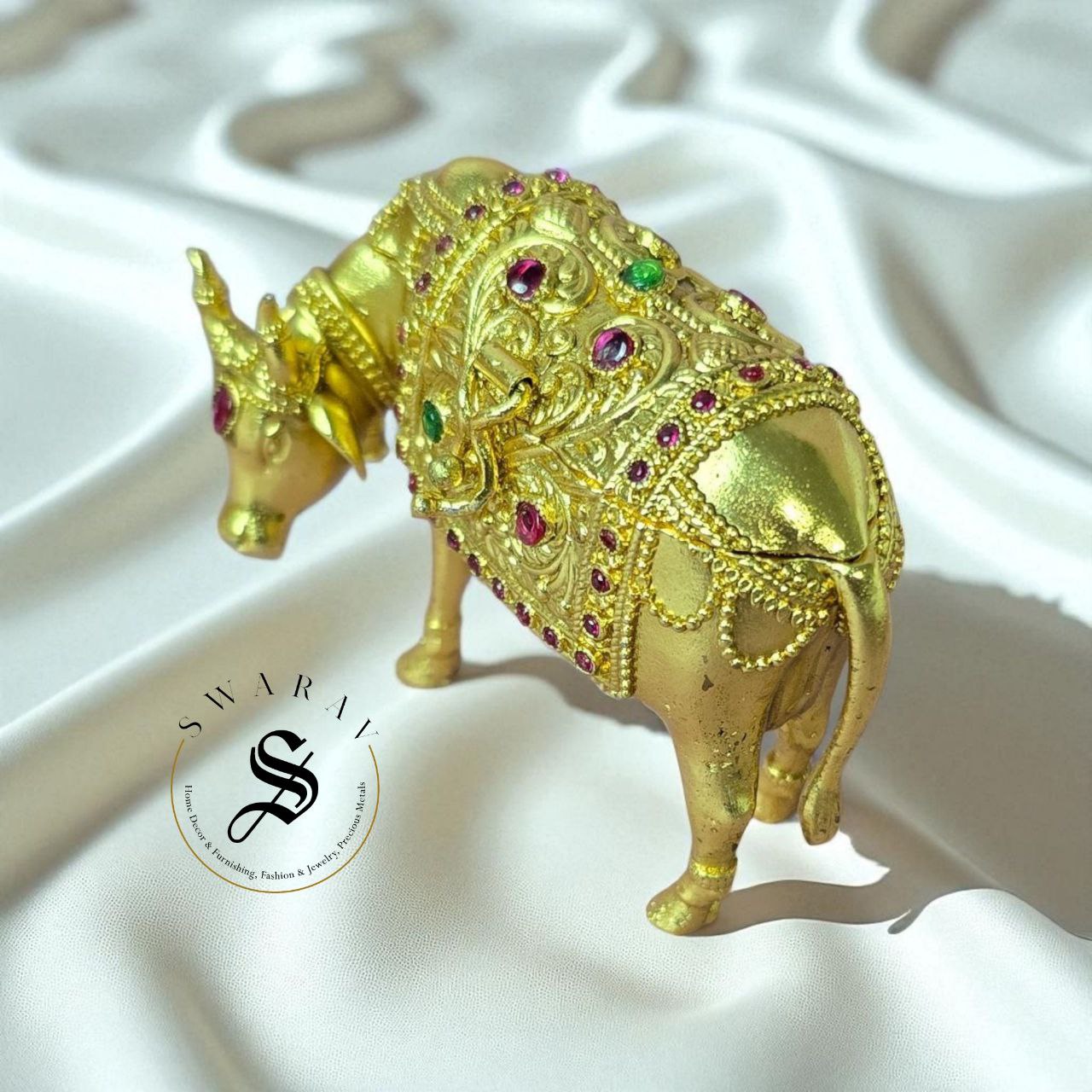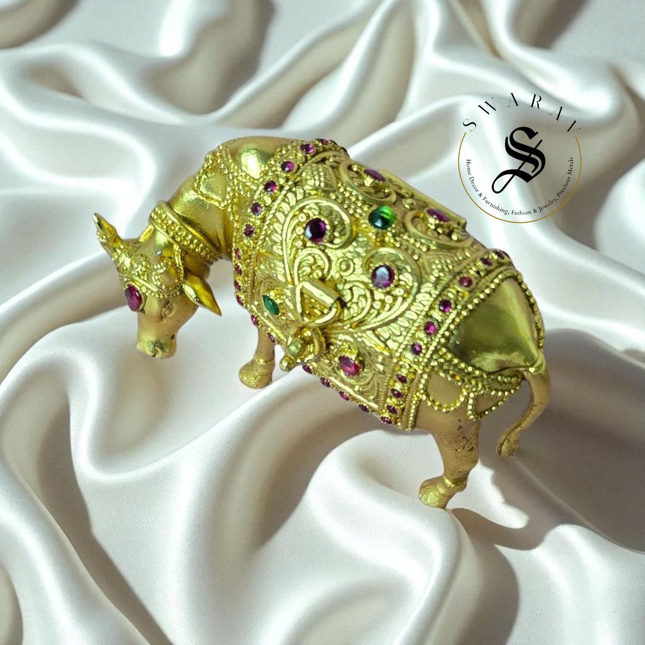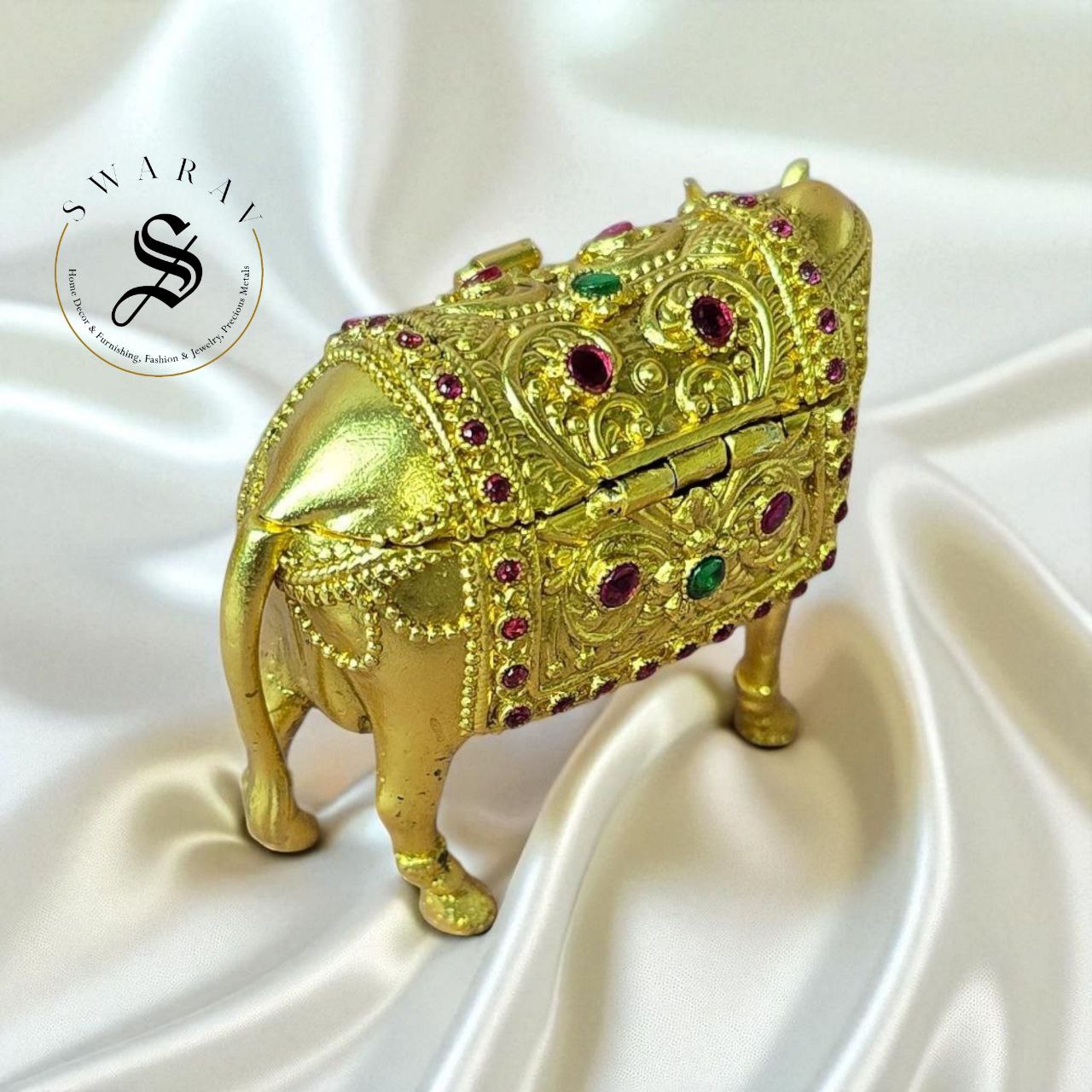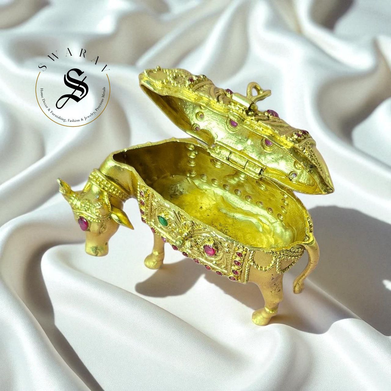 Made of alloy Brass, this beautiful mini kumkum box wwithkamadhenu cow theme with stone work and engraving or Nakshi work is a perfect high quality home/Pooja decor essential for self as well as for gifting.