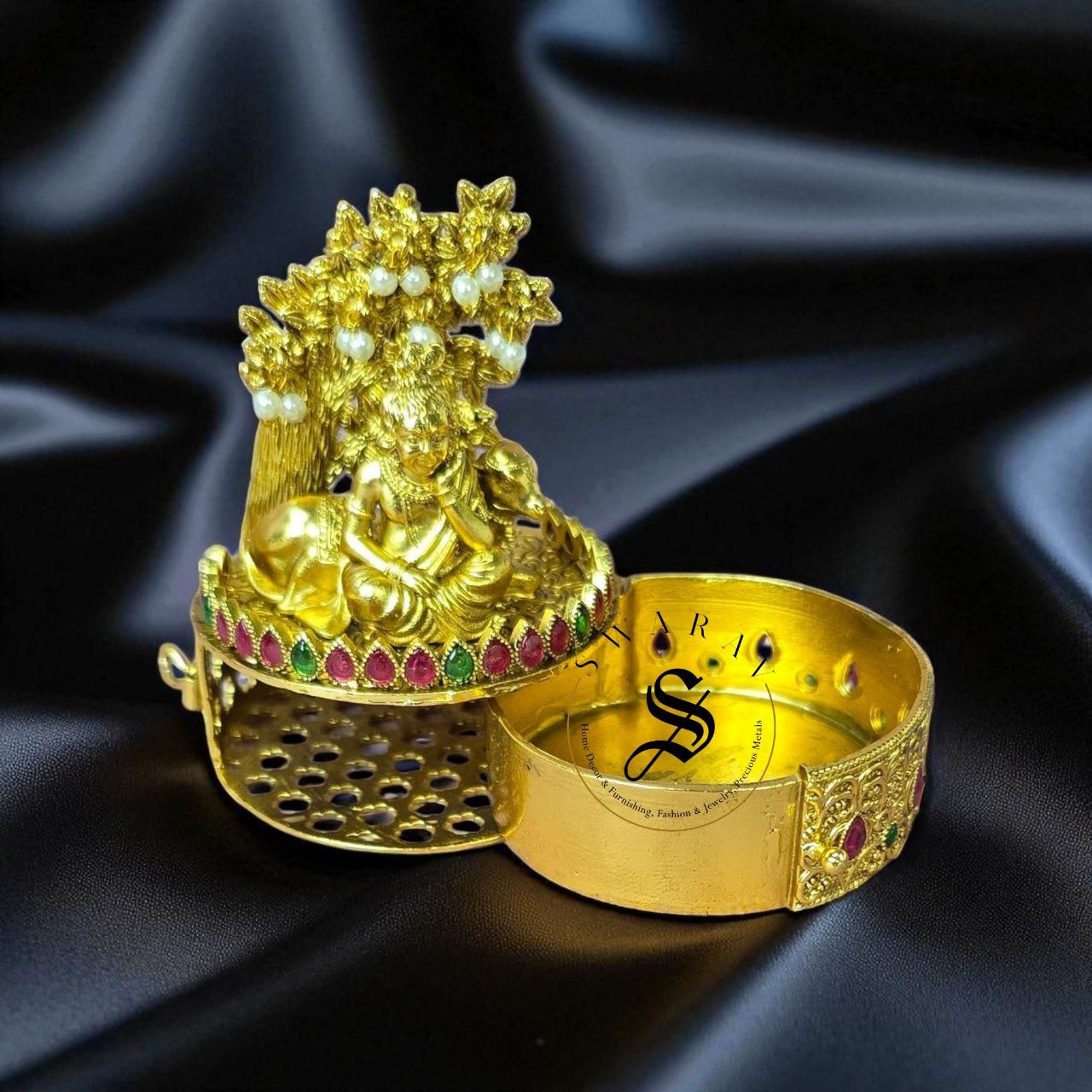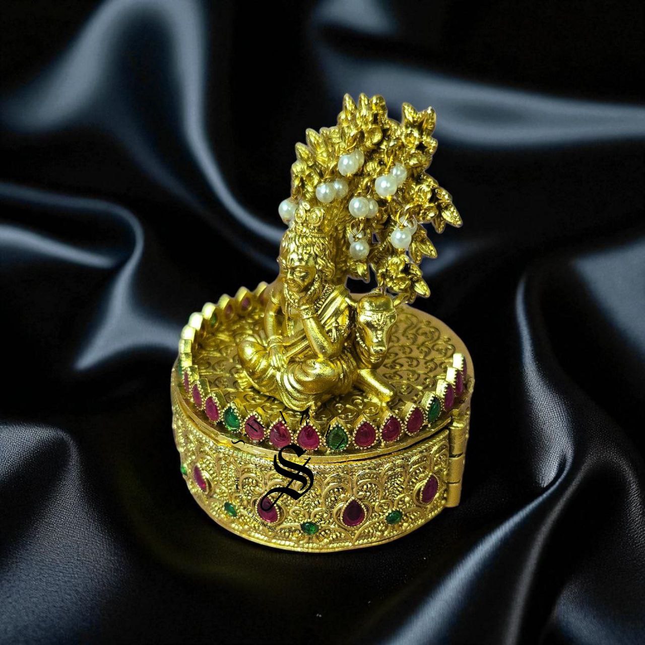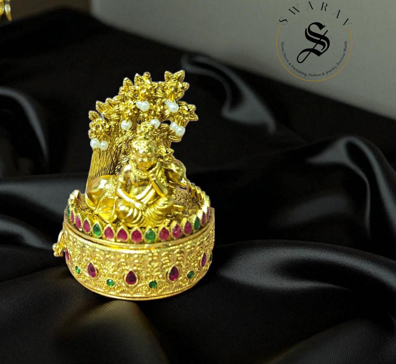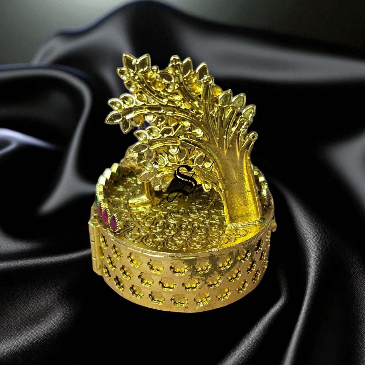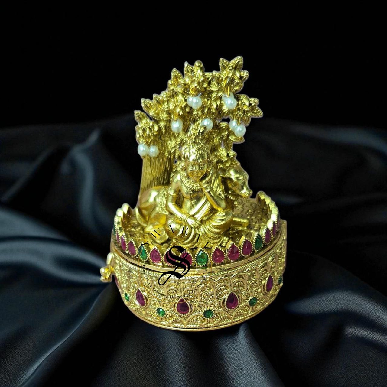 Made of alloy Brass, this beautiful mini kumkum box with krishna under Kadamb tree engraving or Nakshi work is a perfect high quality home/Pooja decor essential for self as well as for gifting.