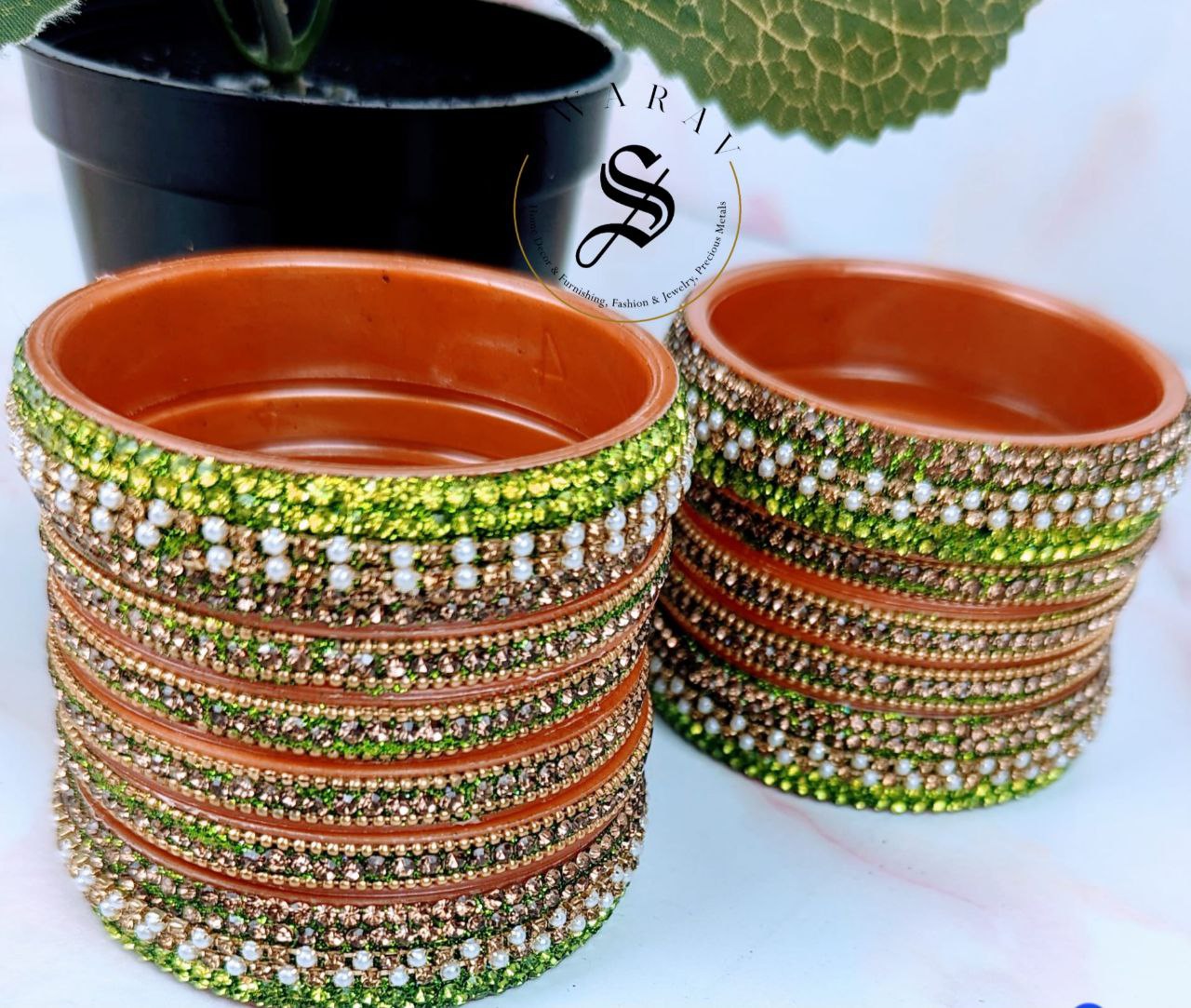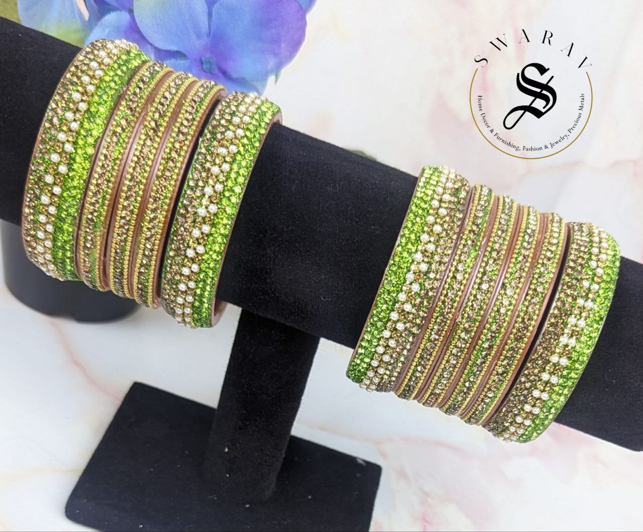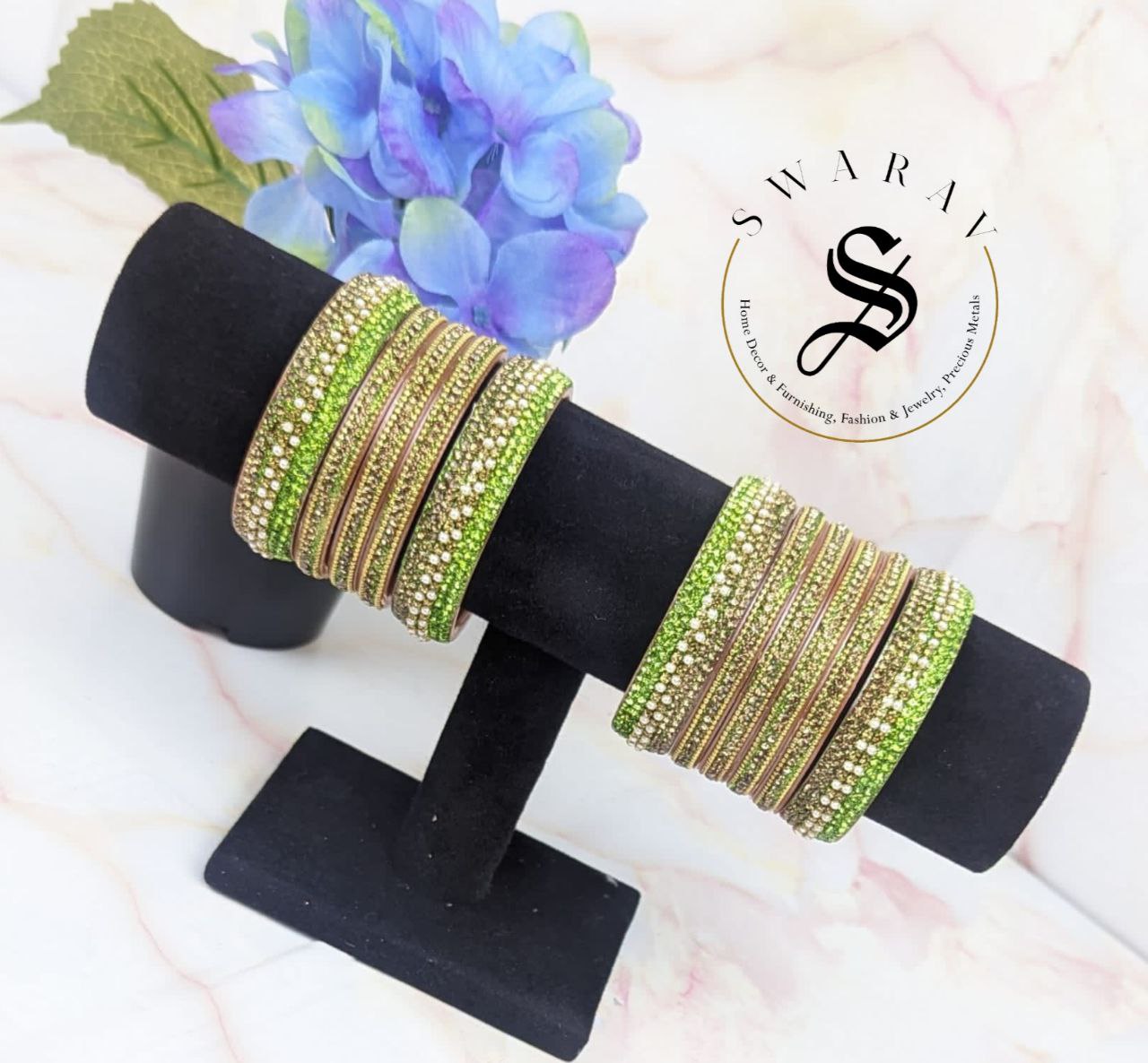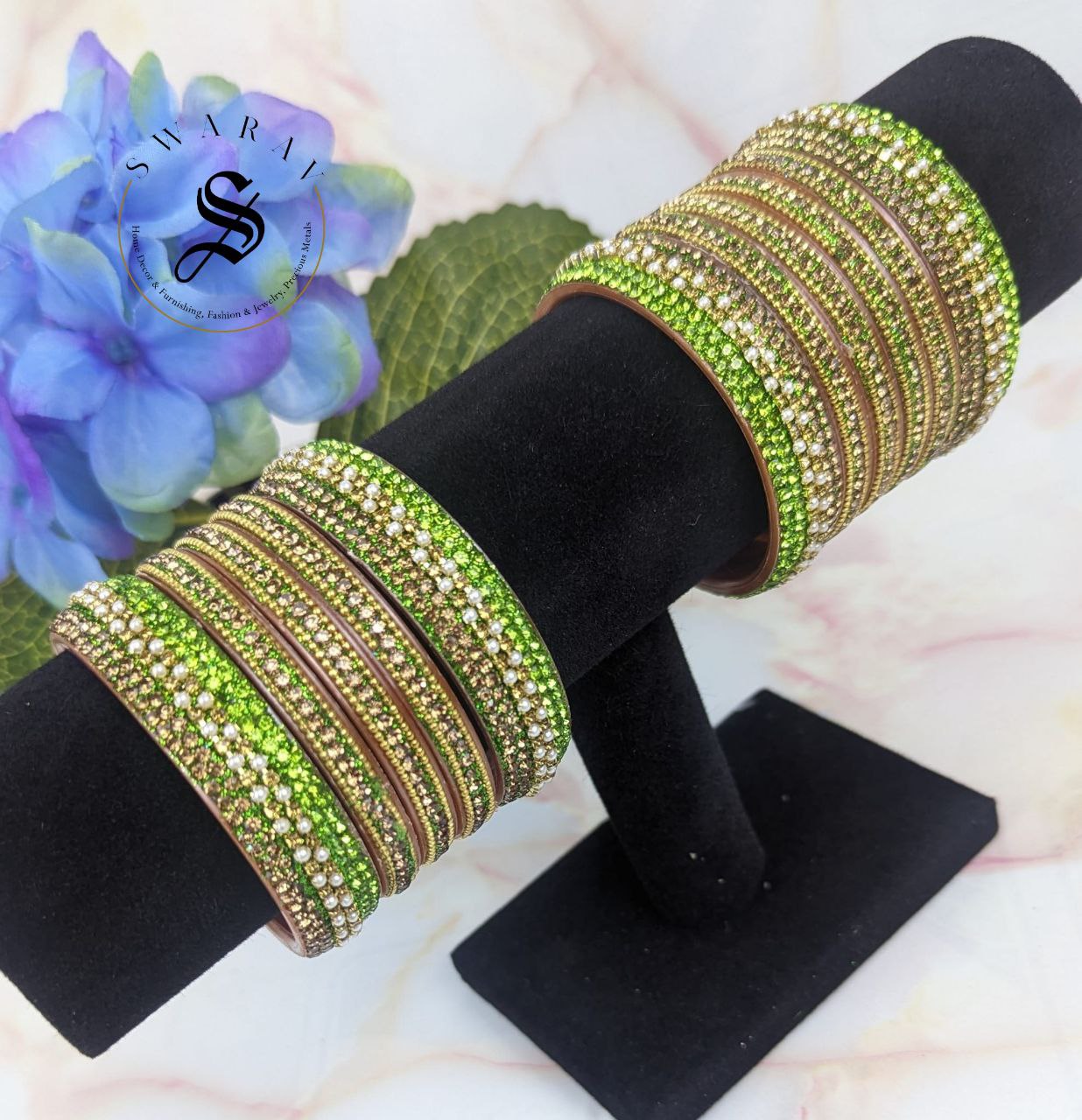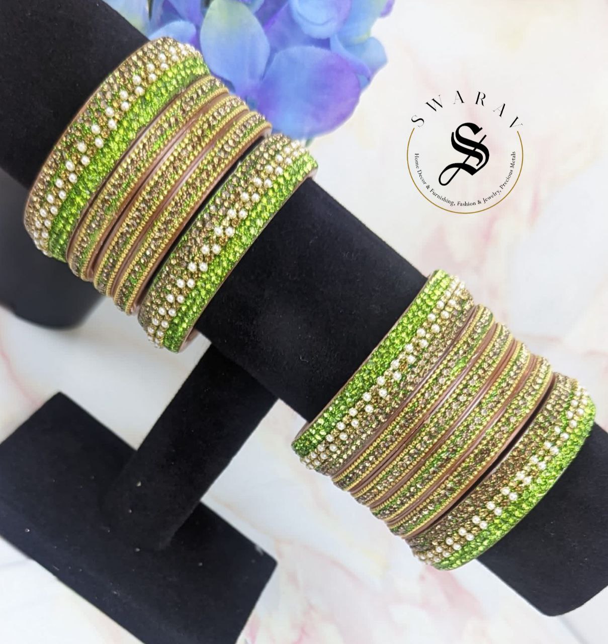 - Its shiny and dazzling golden gliter combination with Parrot green color of stones really makes it a show stopper for any attire and for any time of the day.