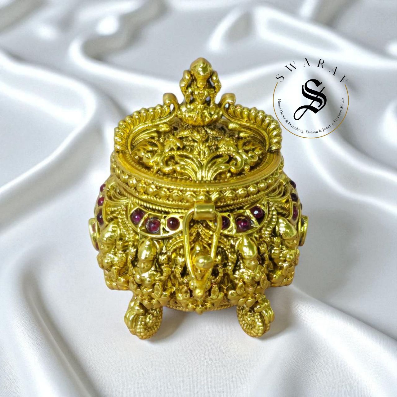 Made of alloy Brass, this beautiful mini kumkum box with Lakshmi engraving or Nakshi work is a perfect high quality home/Pooja decor essential for self as well as for gifting.