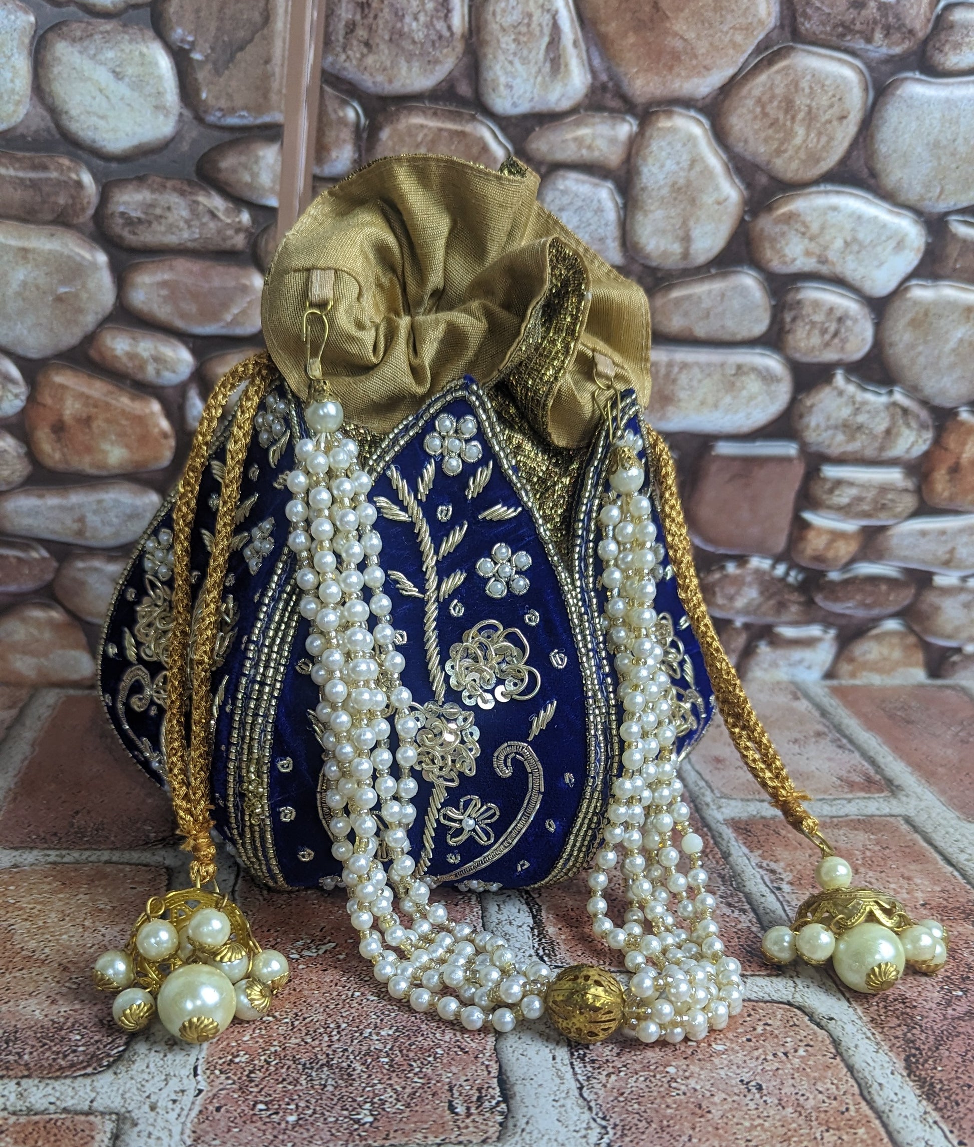 Lotus Potli - Draw string pattern with beads handle -Dark Velvette Blue.