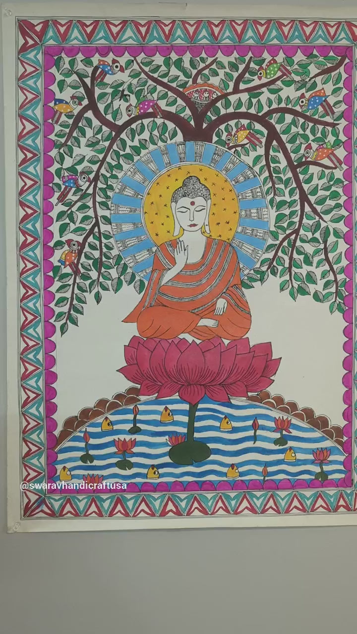 Sourced From the house of National and state award winning Madhubani Artist family of Late Sri Debendra Kumar Jha Ji, this beautiful painting, portrays Gautam Budhdha under the Peepal or Ficus religiosa Tree in his meditating position. Made on Rich orange, green and other colors on handmade canvas , this beautiful painting is surely to attract everyone’s attention when mounted on your wall.