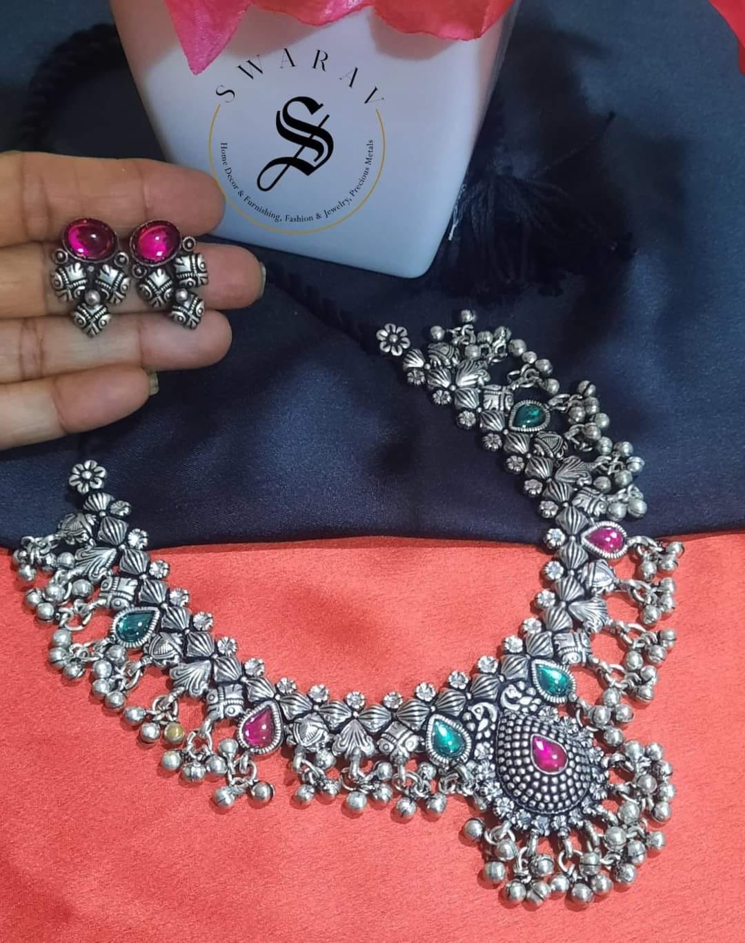 Beautiful Oxidized Kholapuri Saaj with minakari work all around the Necklace and on pendant.