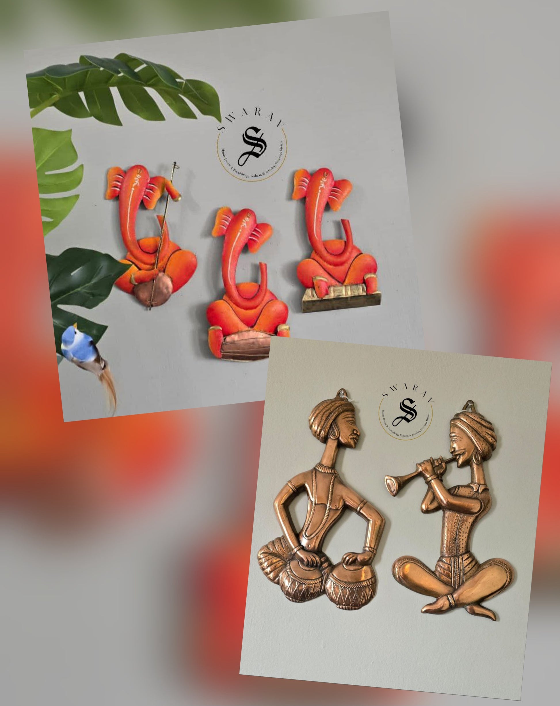 This handcrafted duo set features beautifully designed wall hangings — one showcasing Lord Ganesha playing musical instruments made wrohht Iron, and the other depicting traditional tribal musicians in rhythmic harmony made from Black metal with copper finish.