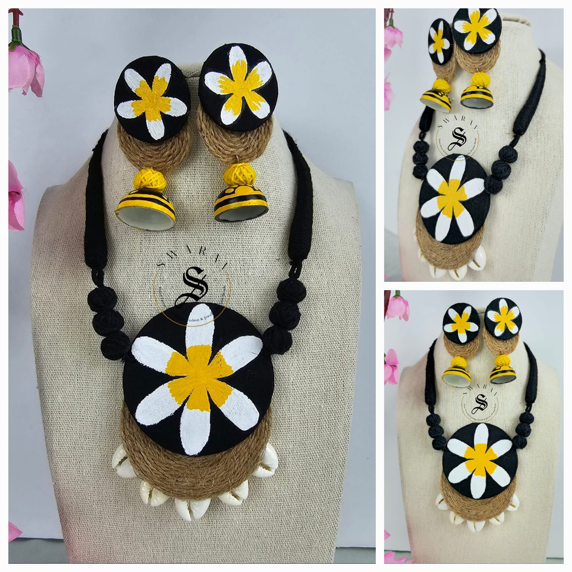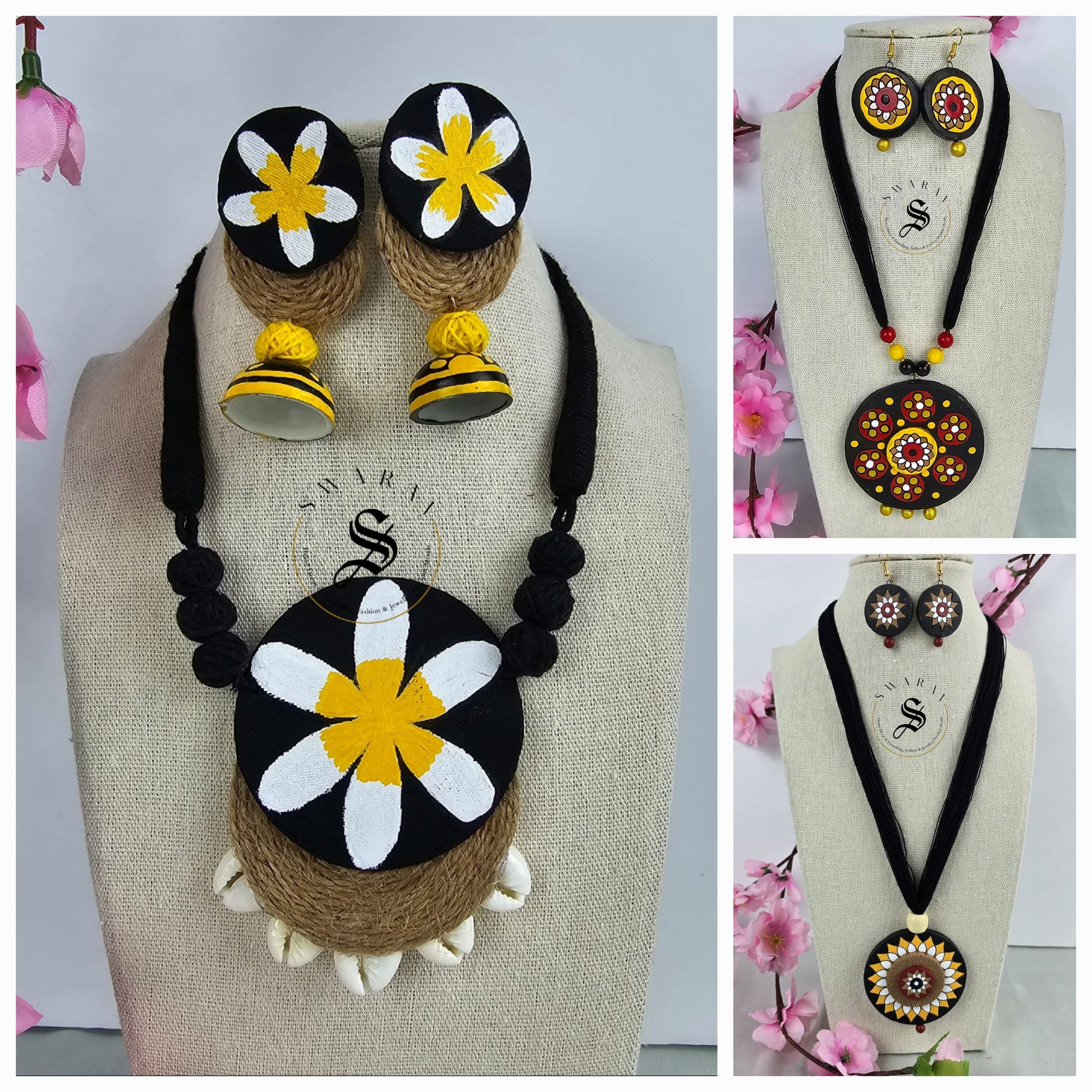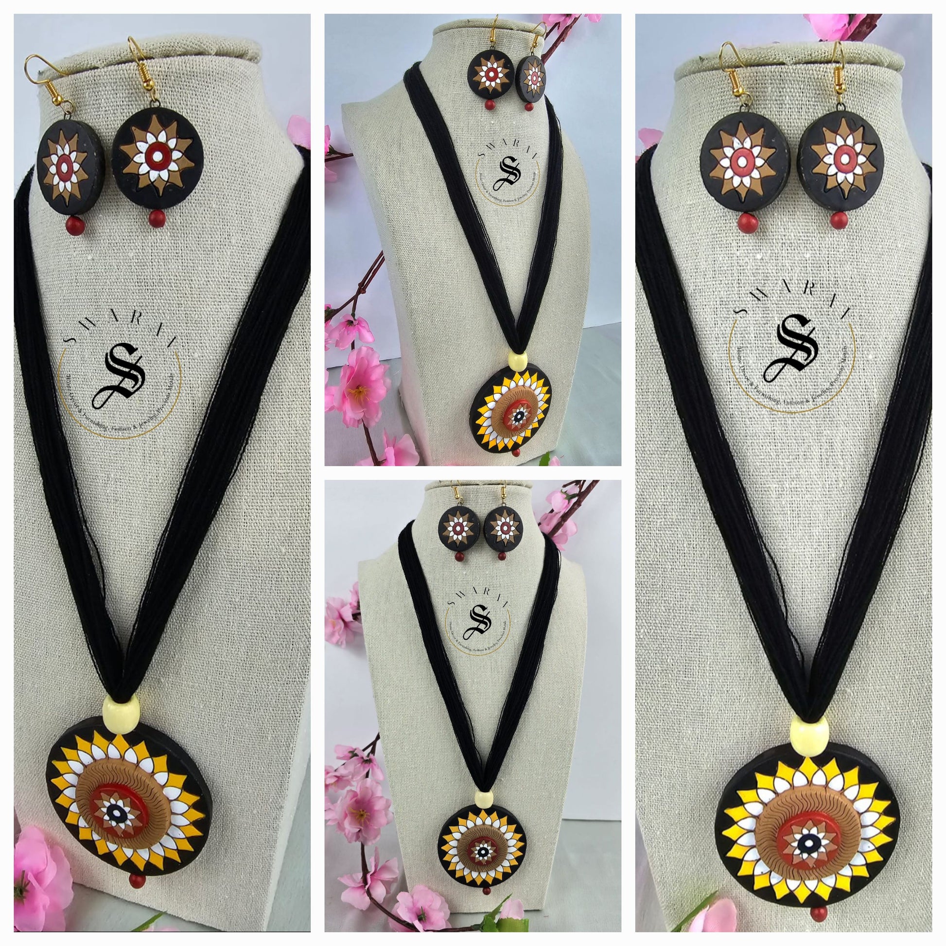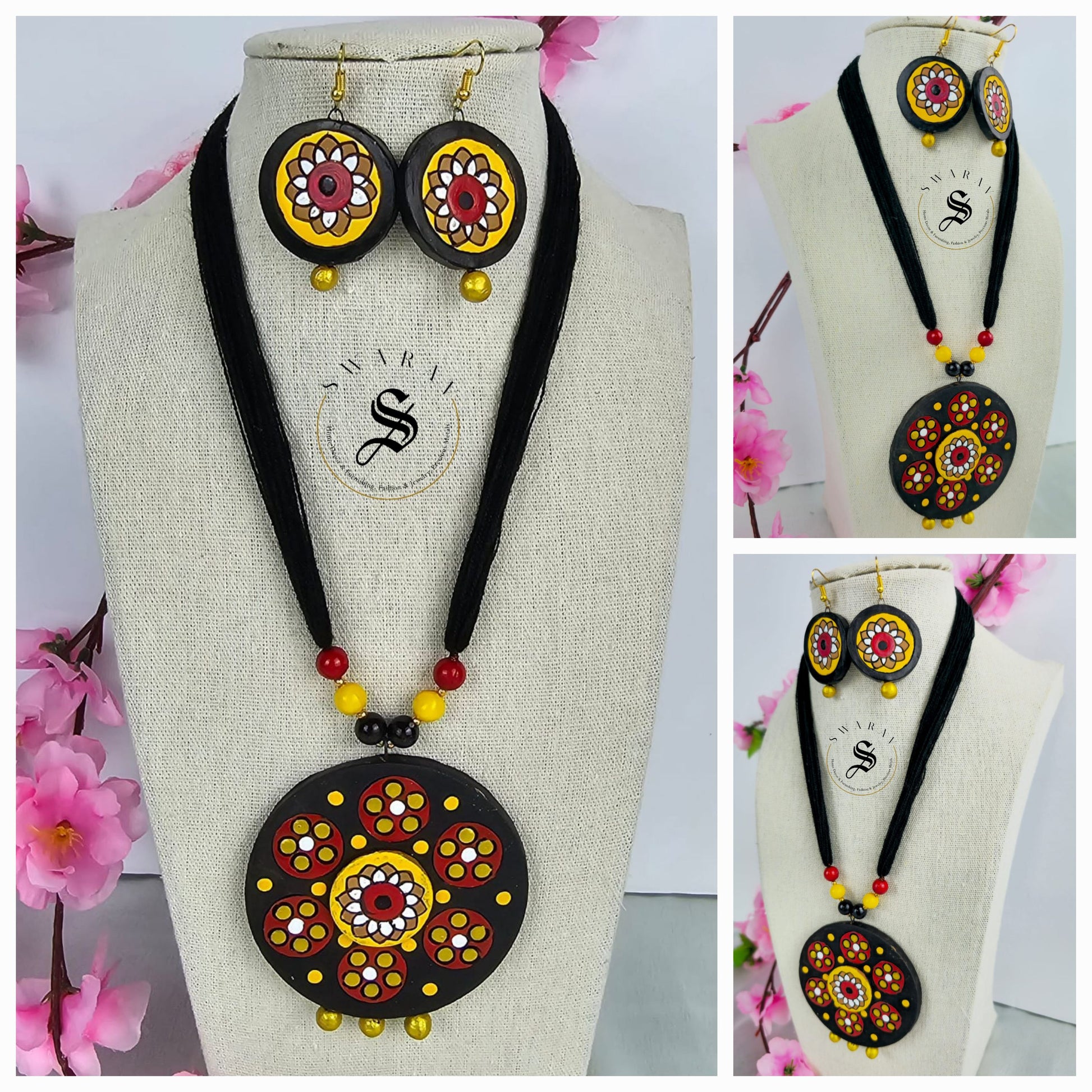 These hand painted wooden pendants and earrings put together on black thread, are truly one-of-a-kind.