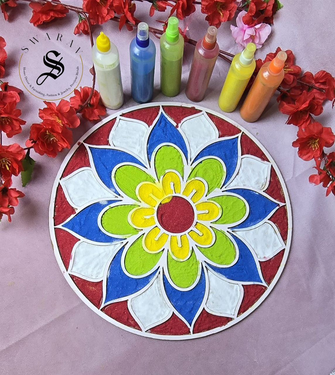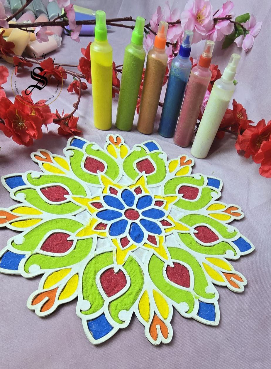 Create stunning rangolis with included colorful art sand or rangoli powder.