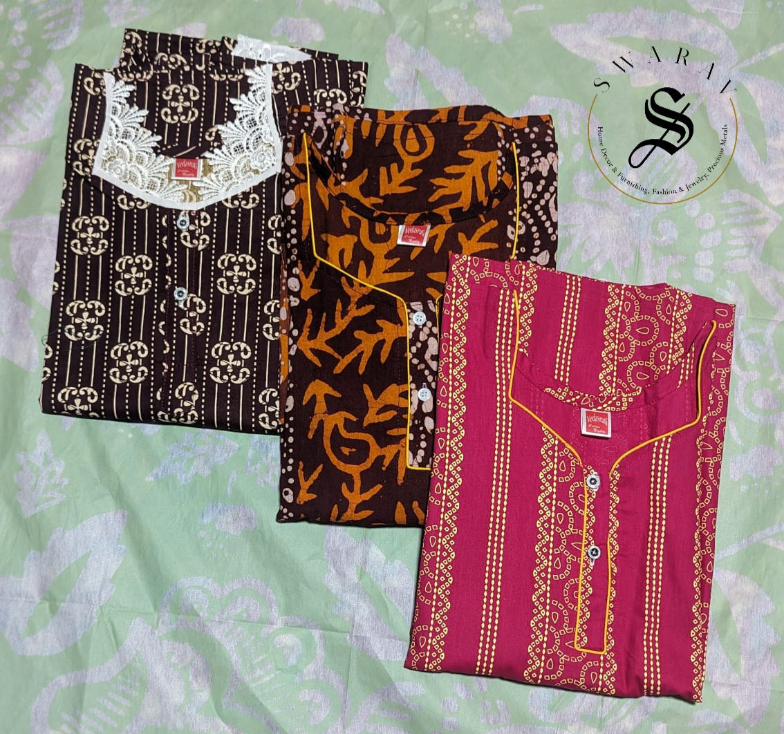 Made with best quality breathable cotton, these nighties add comfort to your night wear. suitable for all skin types and appropriate for all seasons through out the year.