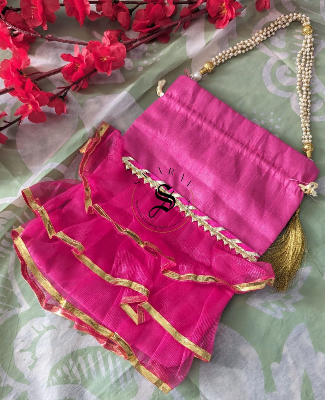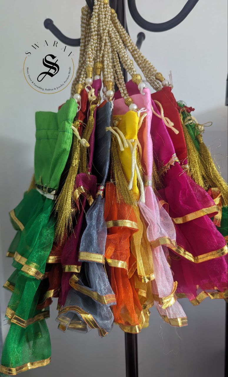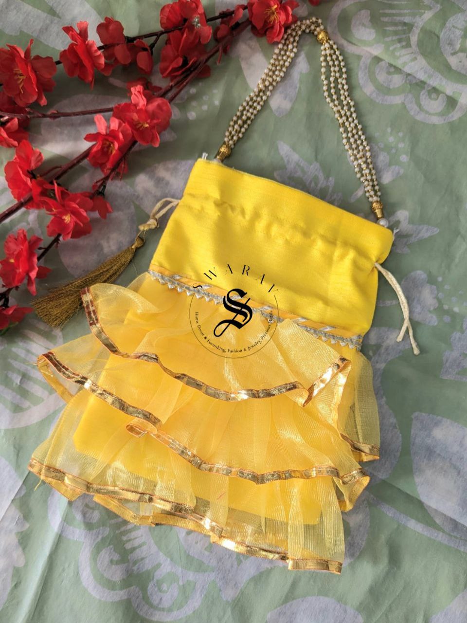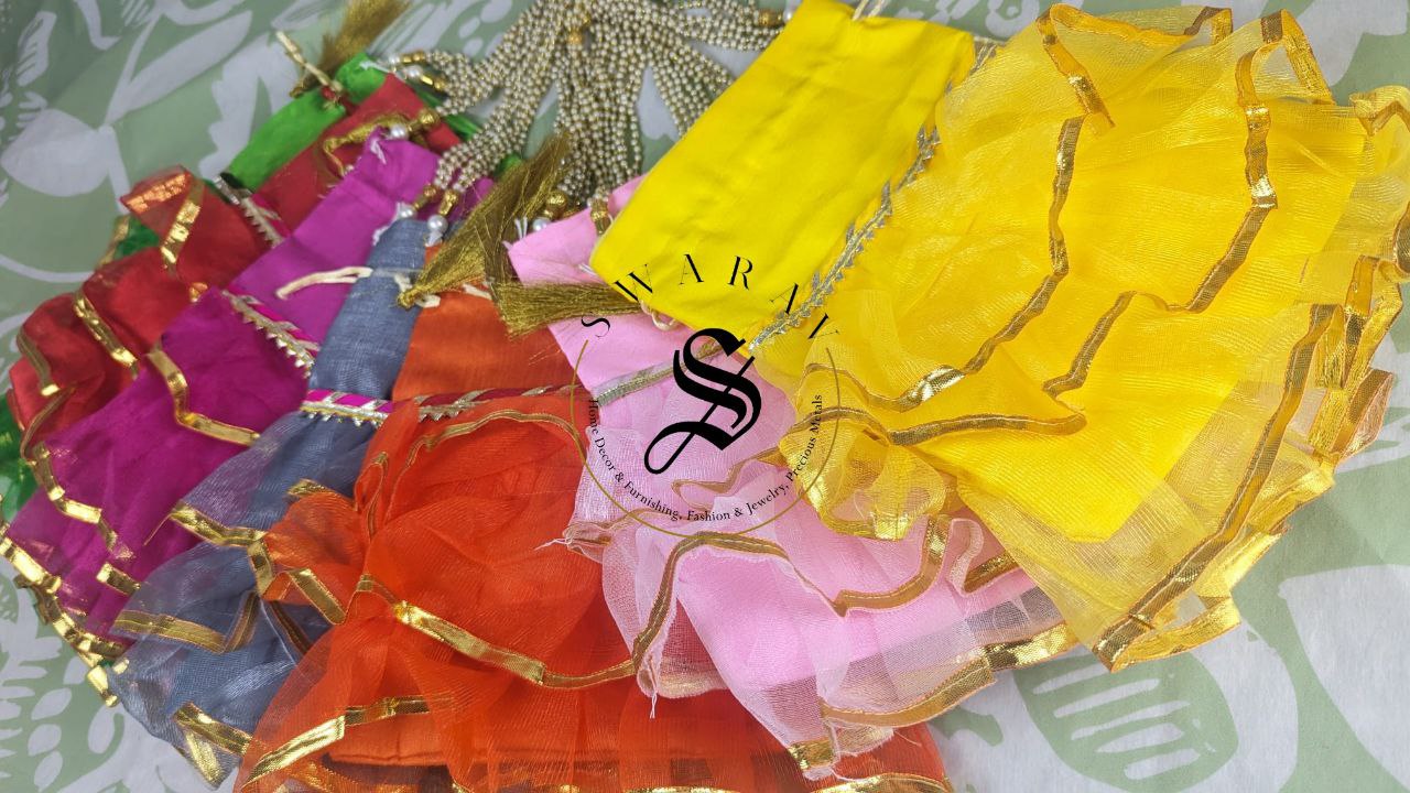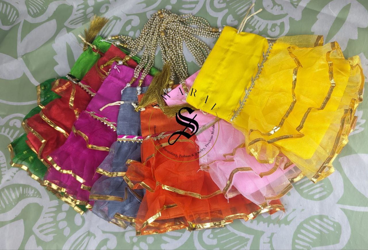 Beautiful Organza fabric Frill Potli or hand held pouches or bag for Gender reveal ( Baby Girl ) baby shower functions to pack goodies or return gifts for your invited guests.