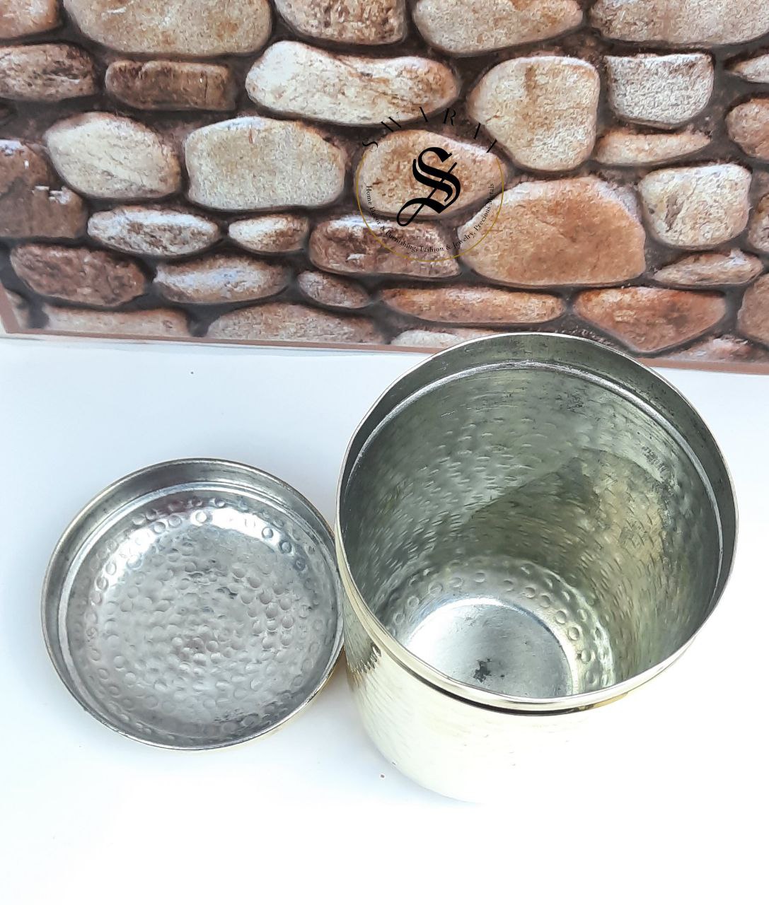Bringing the vibes of traditional kitchen once again with this beautiful hand hammered pure brass storage container/ canister. Now store your Grains, Coffee, Tea, Sugar and cooked or even left over food in this beautifully hand-crafted canisters of Brass.