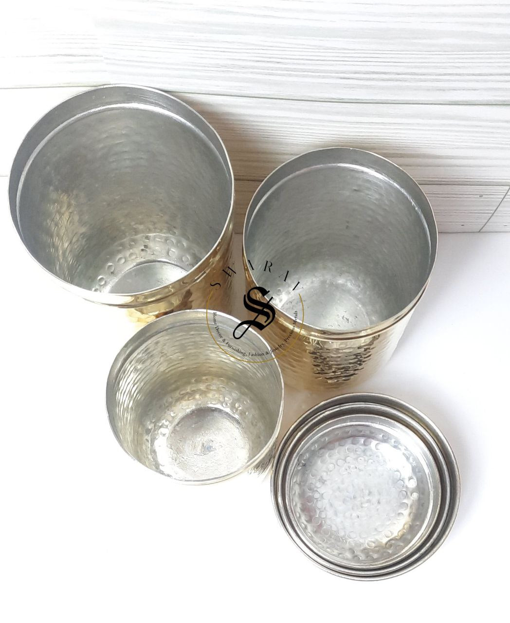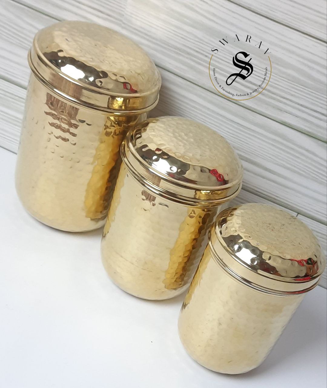 Pure Brass Hand Hammered Storage Container/ Canister/ Dibbas. Set of 3 ( With Tin coating inside)