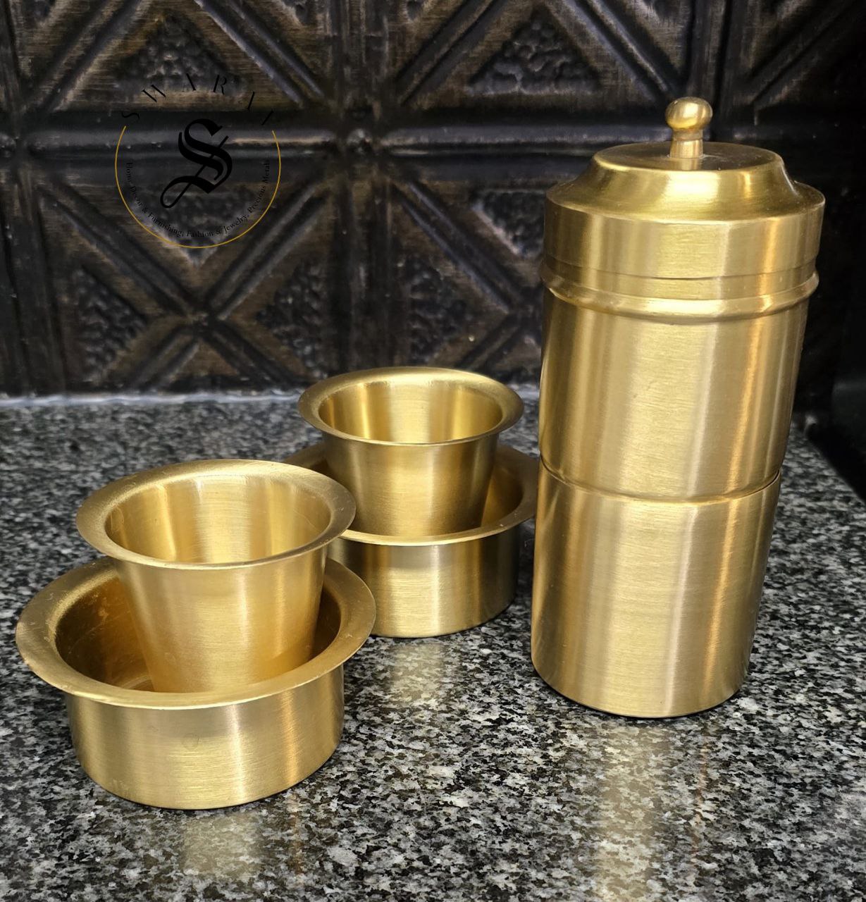 Pure Brass Set of 3, matt finish Indian Coffee filter and Dabara set. ( 2 sets of Dabara and 1 Coffee filter)