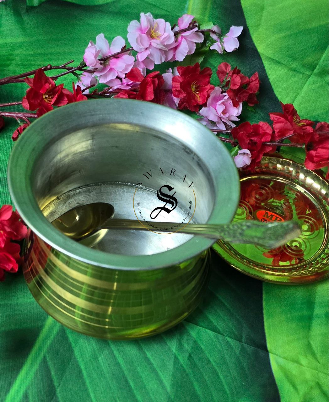 Pure Brass vessel with FREE lid and ladle. Set of 3. Size - Big. Capacity - 2 liter. NOT INDUCTION COMPATIBLE.