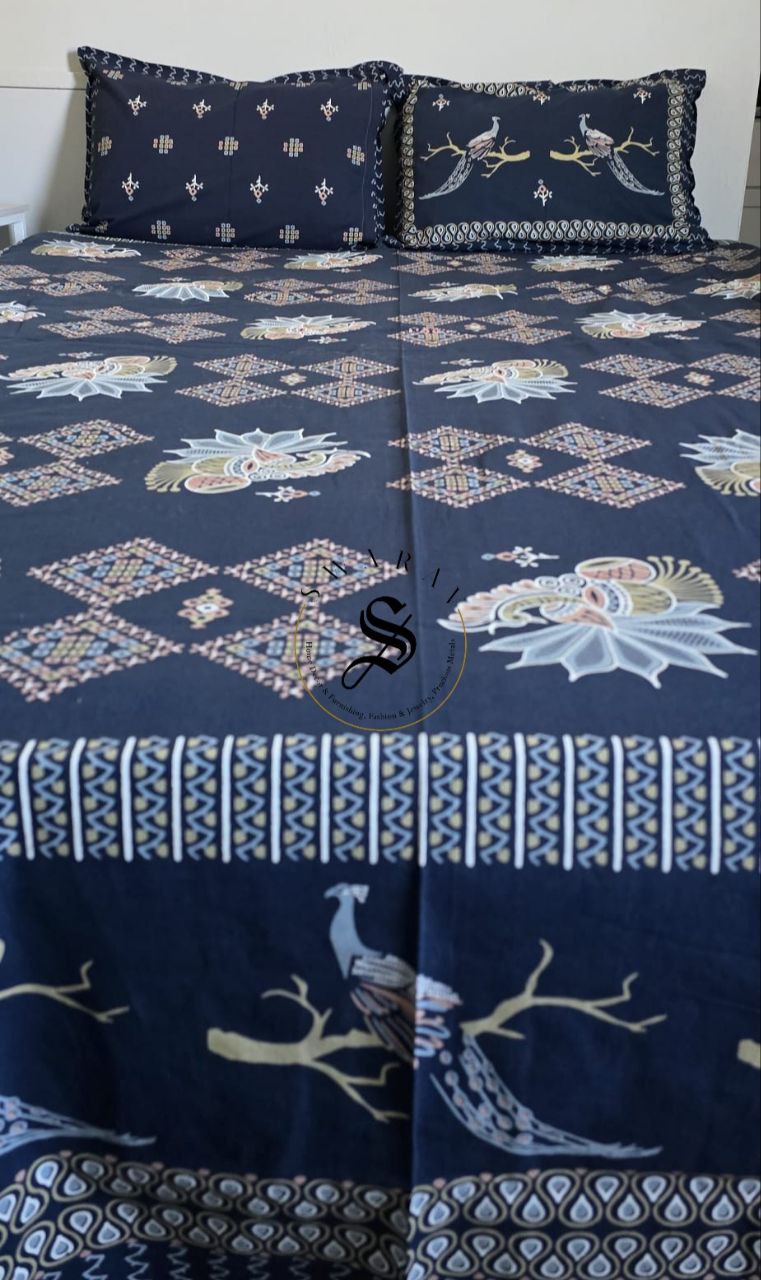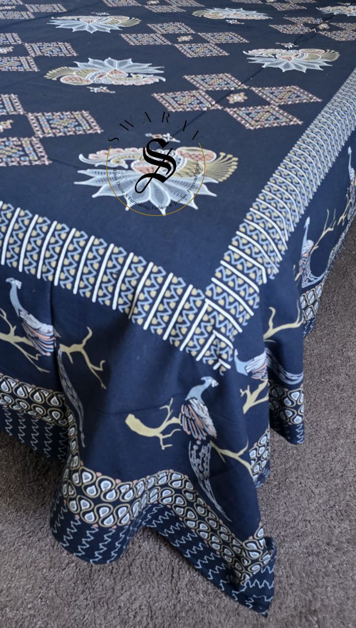 Jaipur Pure Cotton Queen Size Flat sheet Set - 102 by 88 inch. Blue Base with peacock design.