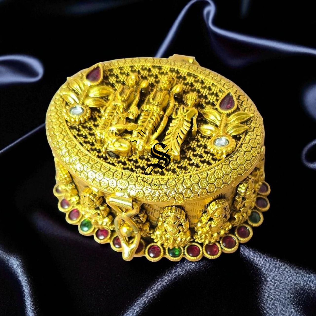 Made of alloy Brass, this beautiful mini kumkum box with Ram Darbar engraving or Nakshi work is a perfect high quality home/Pooja decor essential for self as well as for gifting.
