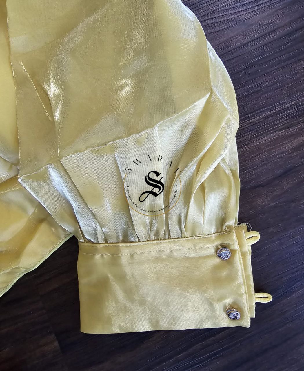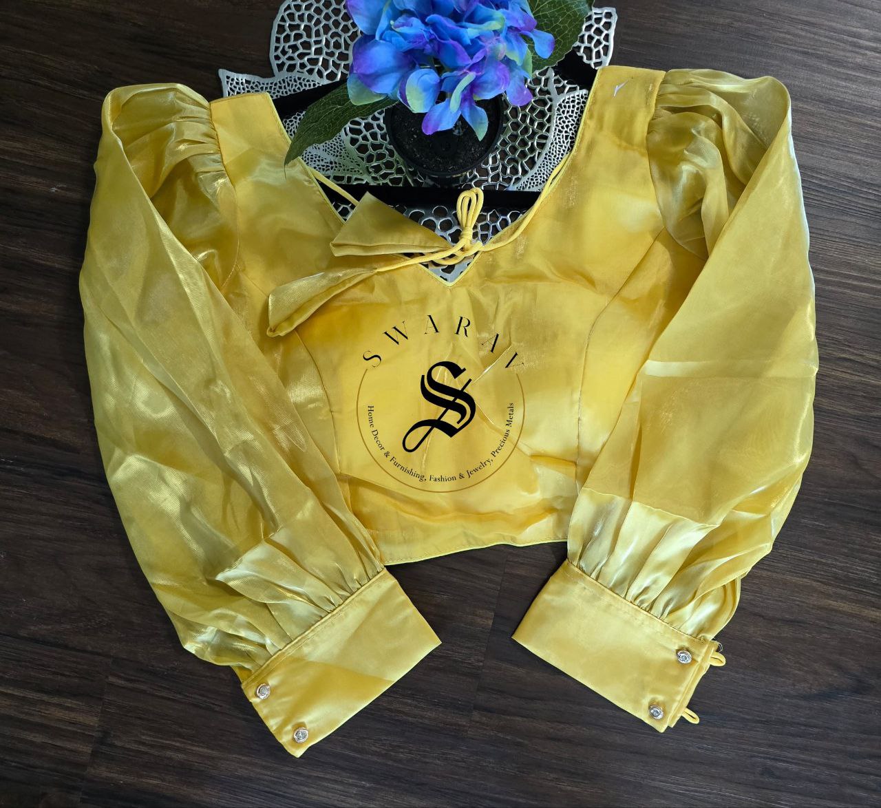 Tissue Silk designer Blouse with puff long sleeve with cuff buttons on wrist.