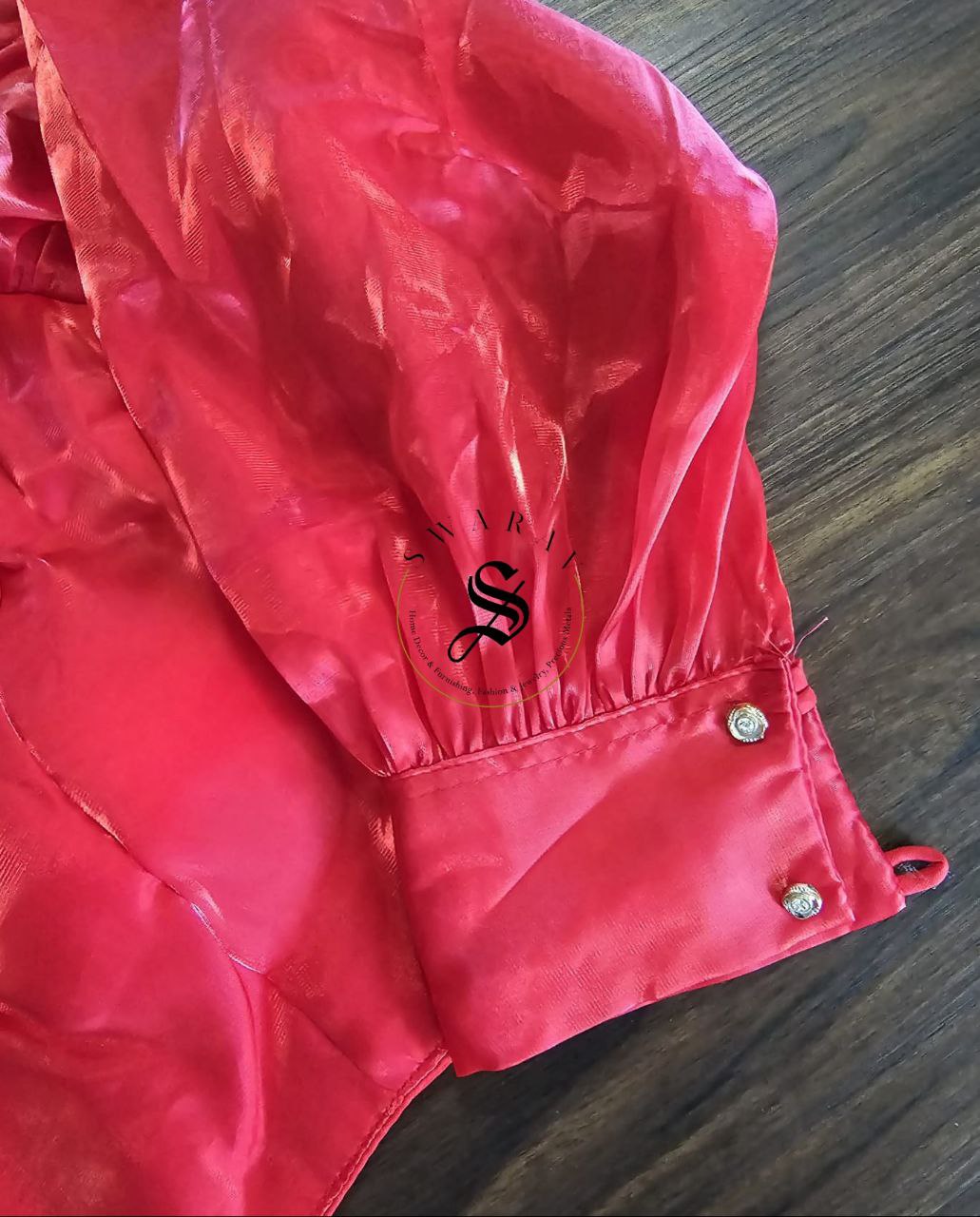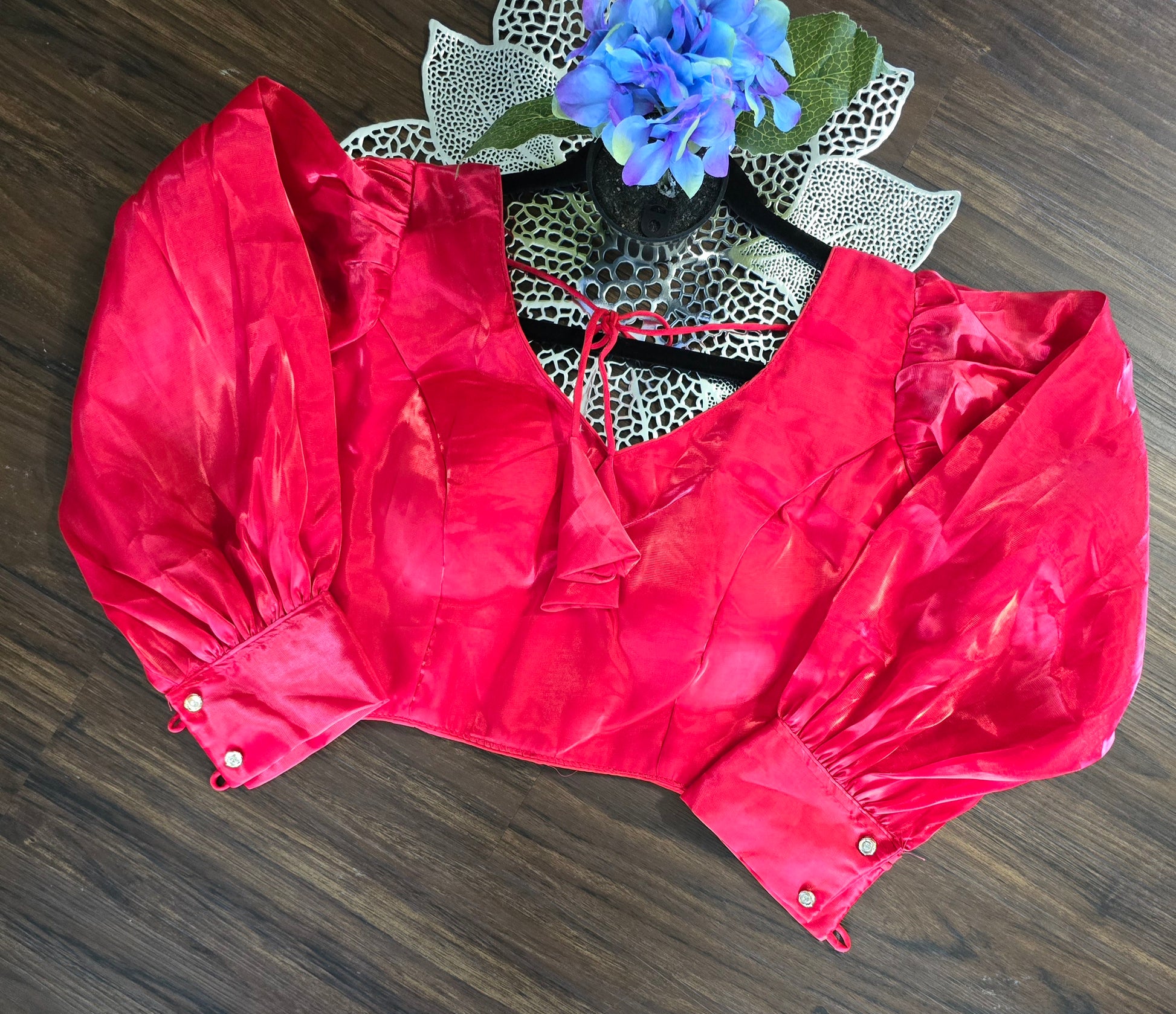 Tissue Silk designer Blouse with puff long sleeve with cuff buttons on wrist.