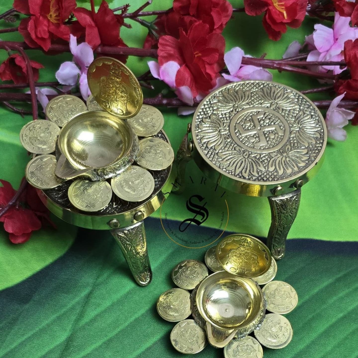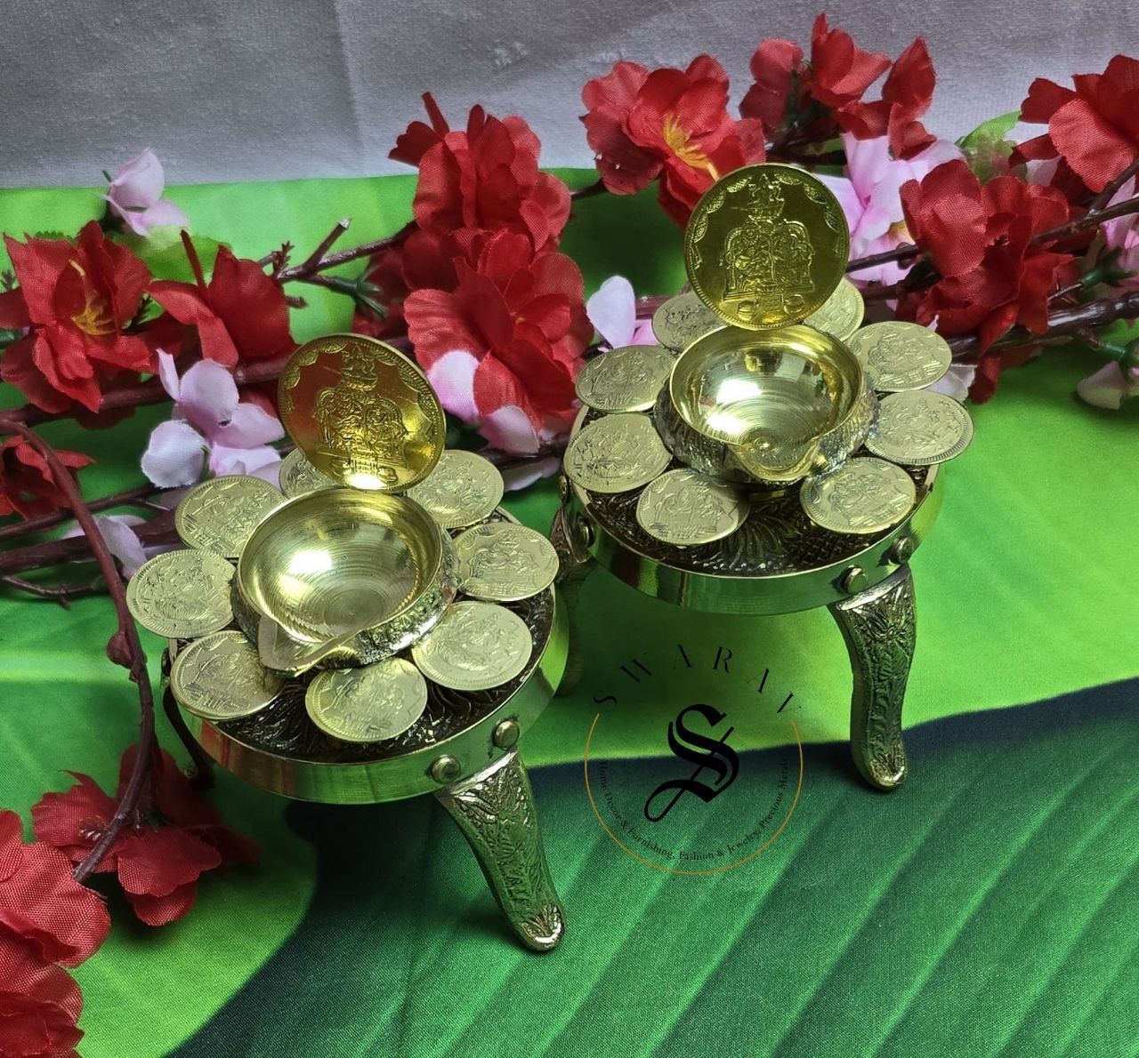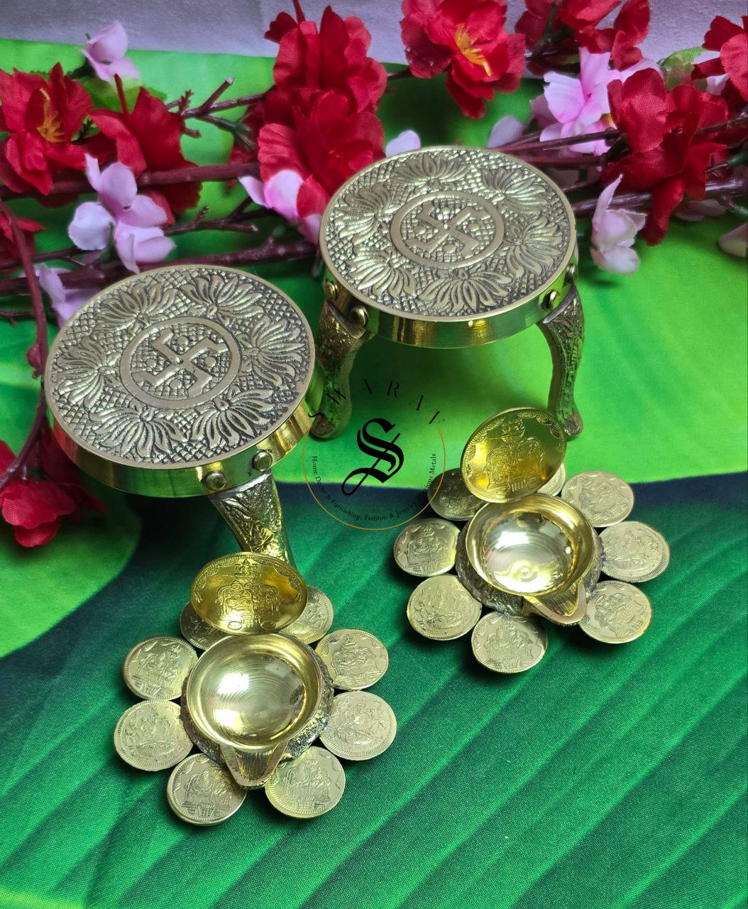 The coin Diyas are unique in themselves and the Beautiful small brass stool/stand perfectly complement the diyas to hold them up.