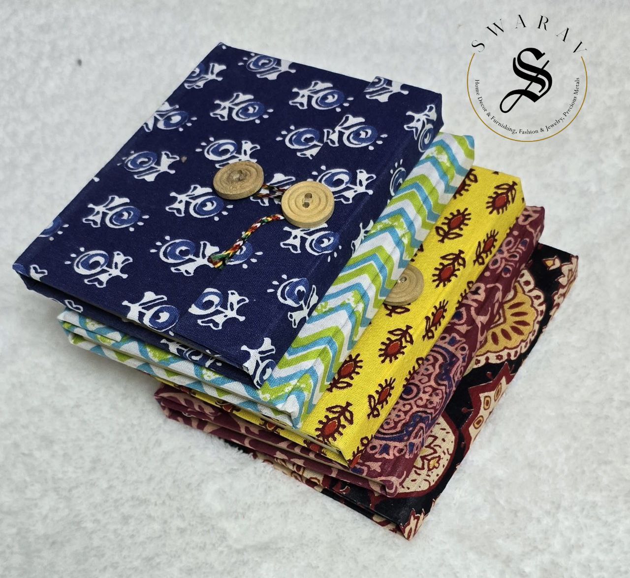 Pack of 5 mini diaries with fabric cover and hand made paper inside.