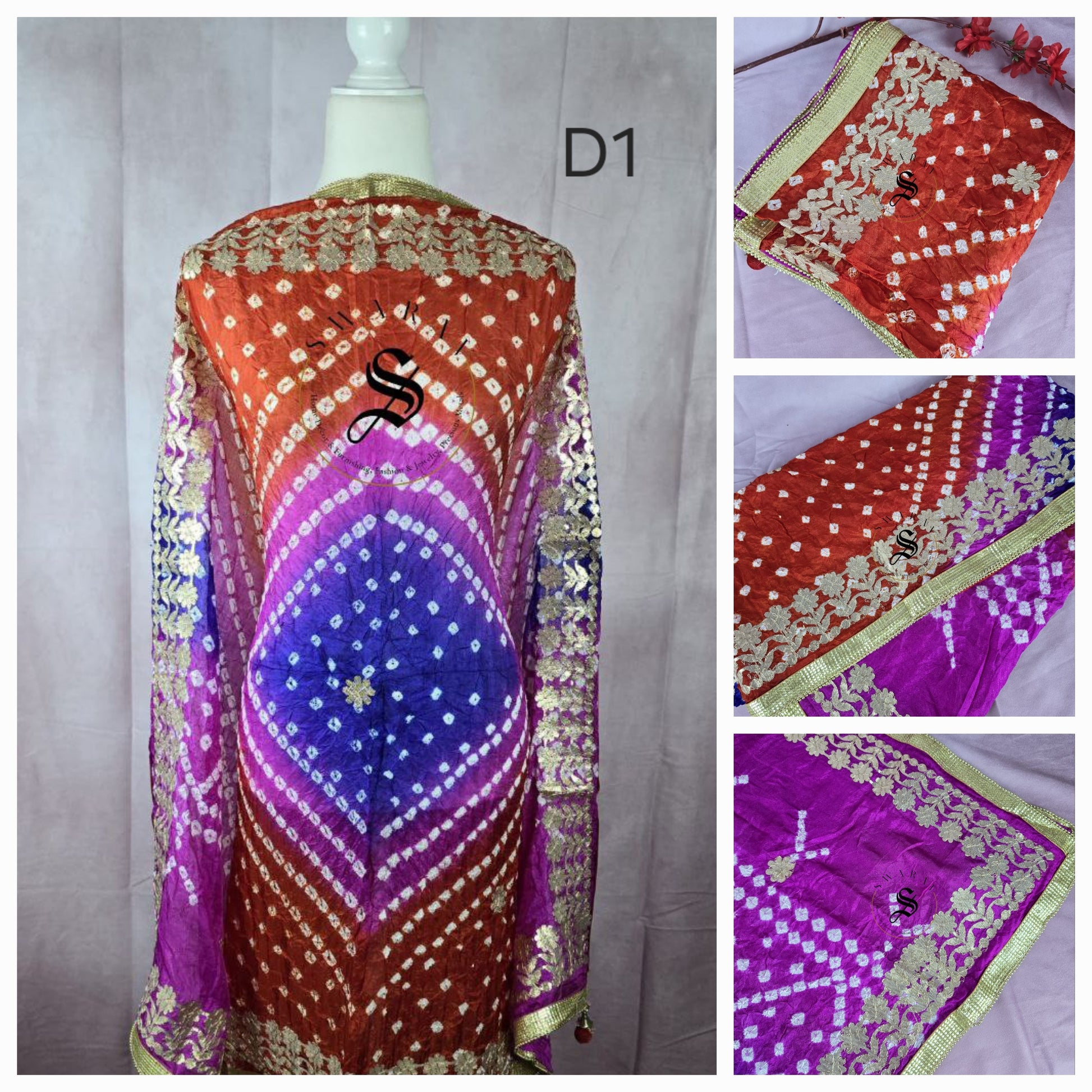 Style : Hand Bandhni or Tye and dye with Gota Patti stitched to fabric.