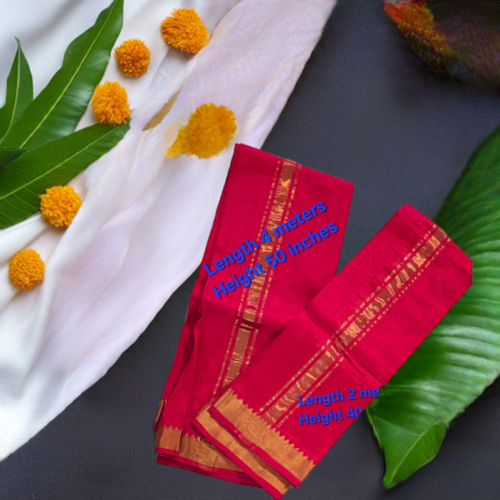 Men's pure Handloom cotton silk mix Angavastram and Vesti set with golden zari woven border. (D4). Total length for the set - 6 meters.