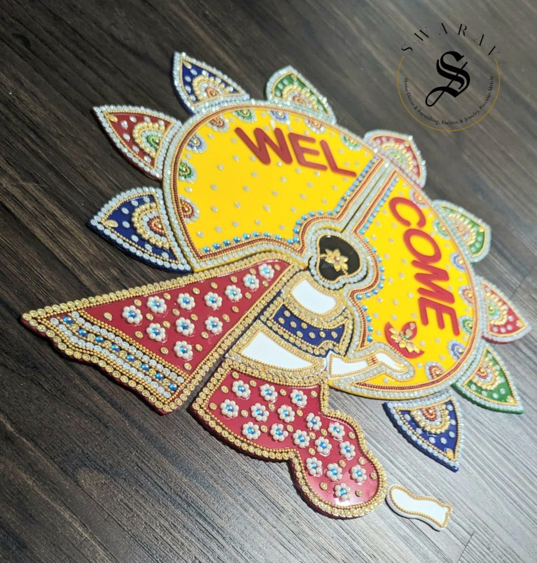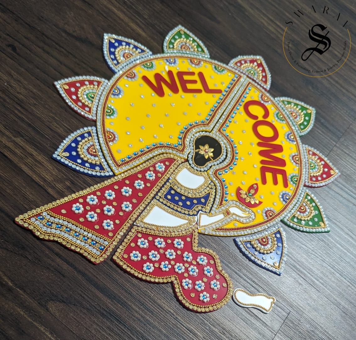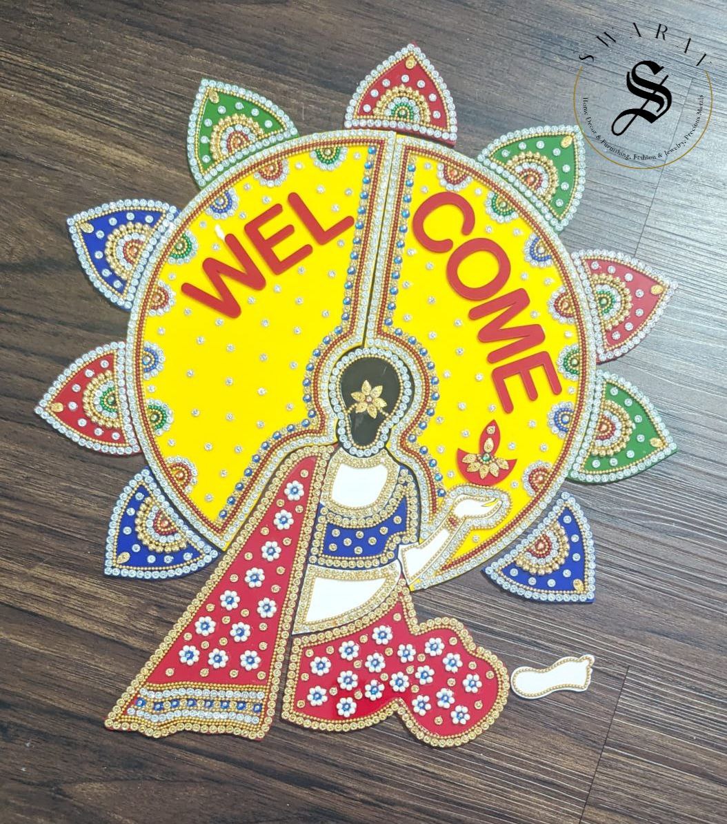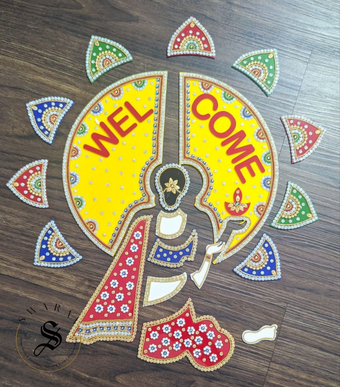 Welcome Lady Rangoli - a must for all festivities. Bring home this beautiful vibrant festive special multi color, completely hand made Acrylic Rangoli set of 19 pieces to decorate your floor on special occasions.