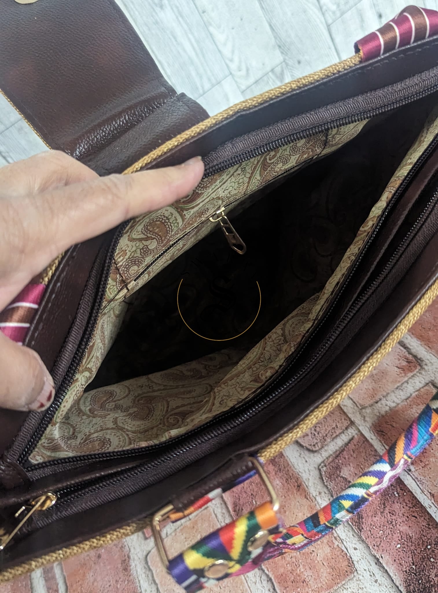 Crafted with quality jute material, this tote exudes elegance and practicality. The spacious 13 by 14 by 5 inch size, offers ample room for all your essentials, while the multi-color geometrical pattern satin straps add a touch of glamour as well as character to the bag.