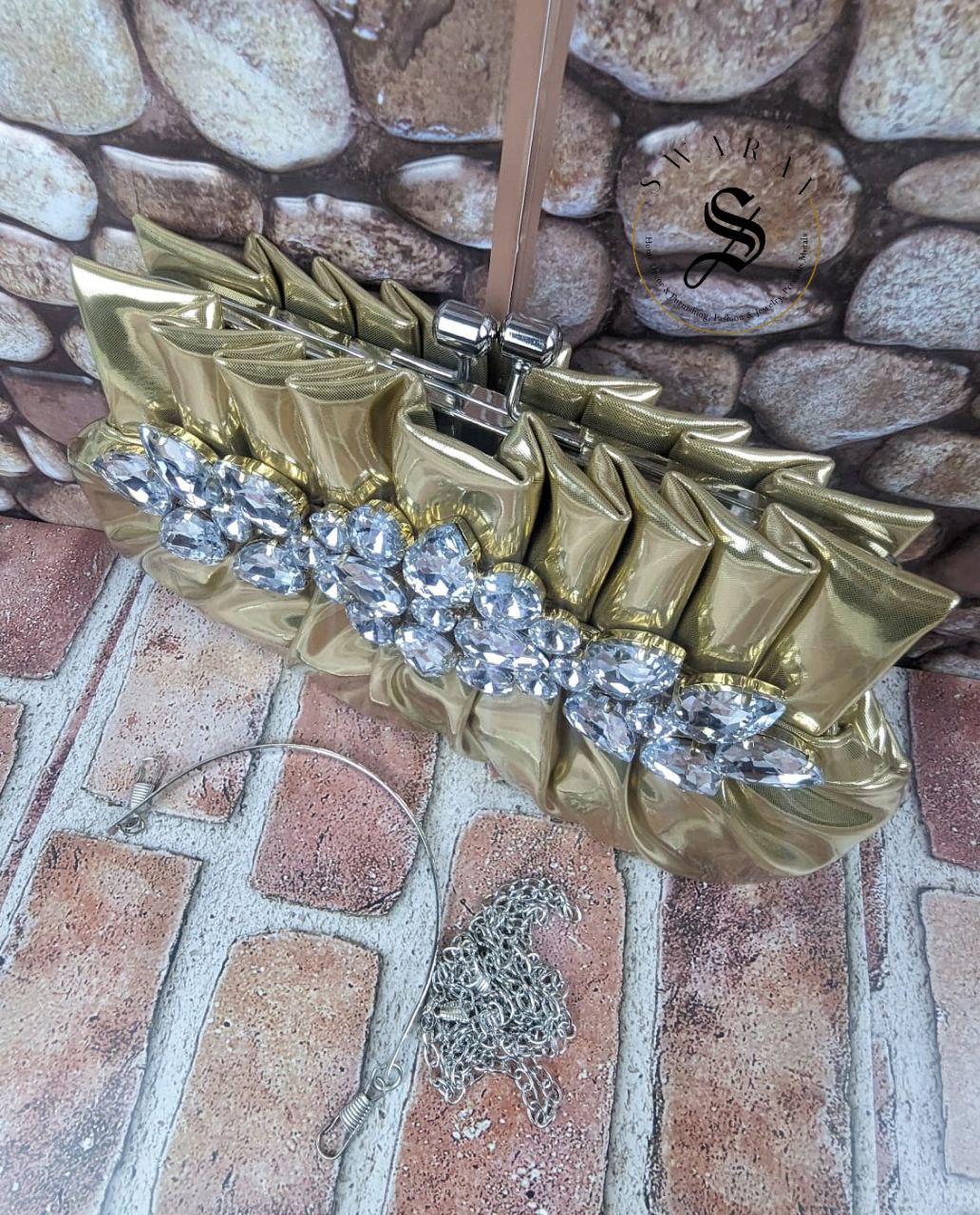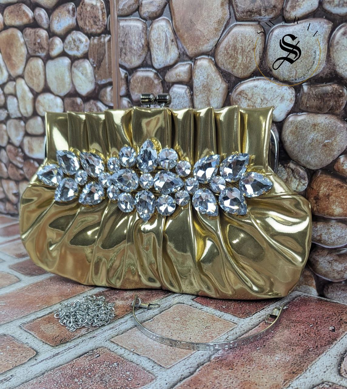 Women's Pleated crystal stone broach Party clutch. Size - 9 by 5 inch. Color - Golden.